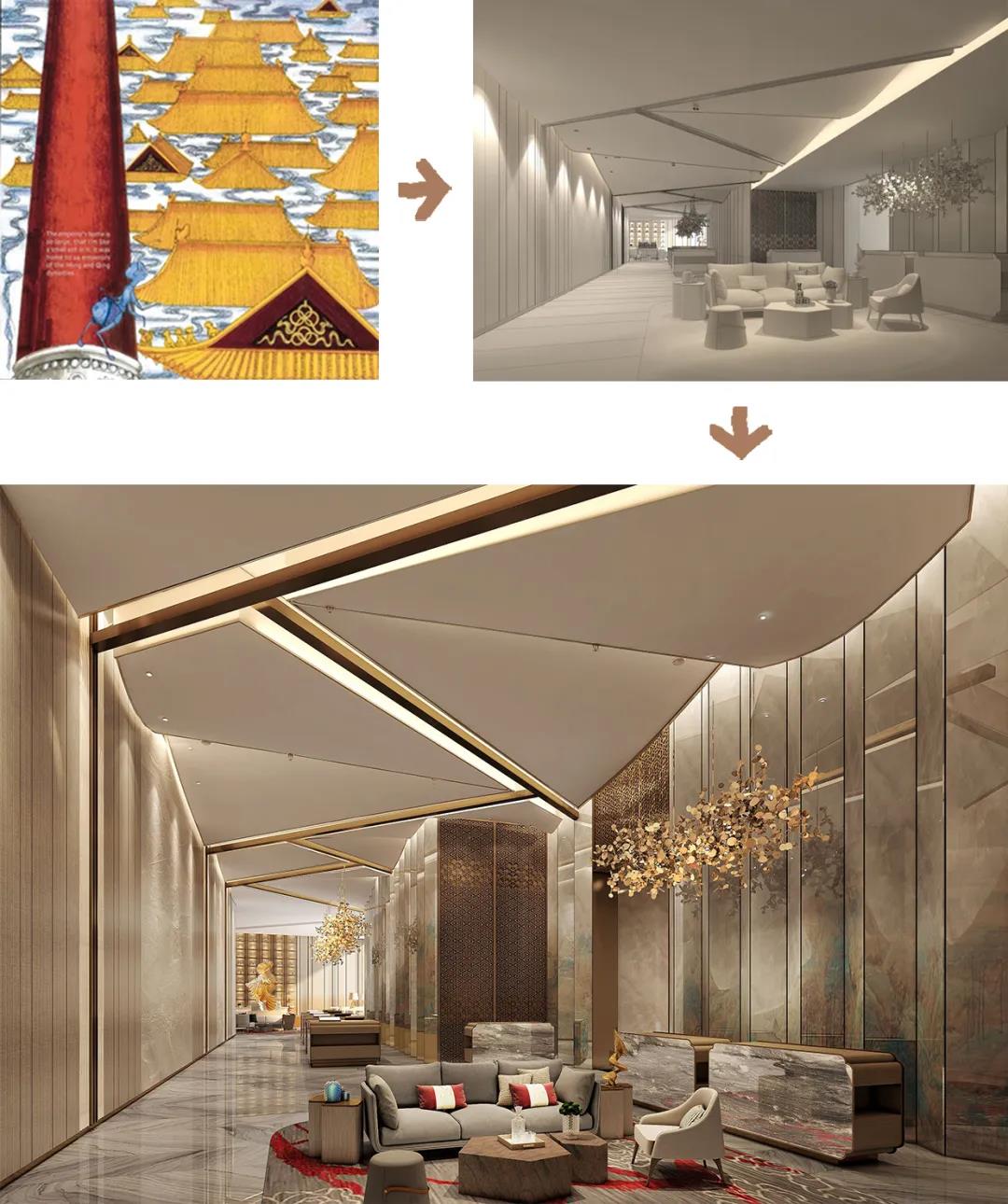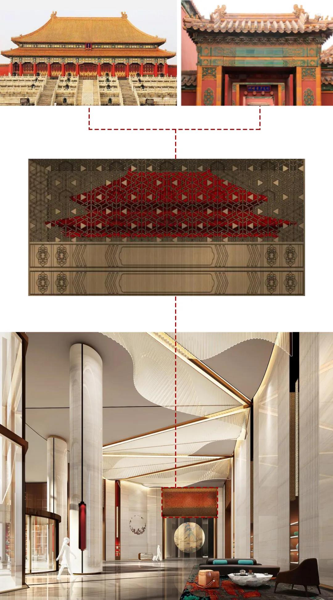 作为古代皇家理政、礼宾、寝居的最高等级场所,紫禁城功能配置完善,布局严谨有序,装饰注重内涵,是传统文化与皇室建筑集大成者,为酒店“皇家礼制”设计从格局、形制、色彩、材质到装饰提供了详实的参考依据。