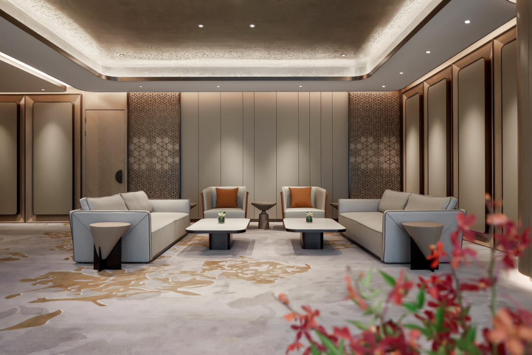 VIP休息区、接待区与北纬31度餐吧连成通透宽敞的L层接待大厅,大厅吊顶呼应G层公区设计,几何切割的飞檐造型层层递进,导引视线与路径。大厅中央山水纹大理石接待台一字排开,整齐有序。