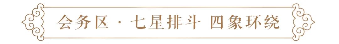 门头设计取法中国皇家最高等级的建筑样式,“额枋”为屏,嵌“重檐庑殿顶”艺术装置,庄严绚丽,以示无上尊荣。下方门厅设折扇“屏幕”,化虚为实,意境悠远,宾客前行如入天上宫阙,寓意高升。