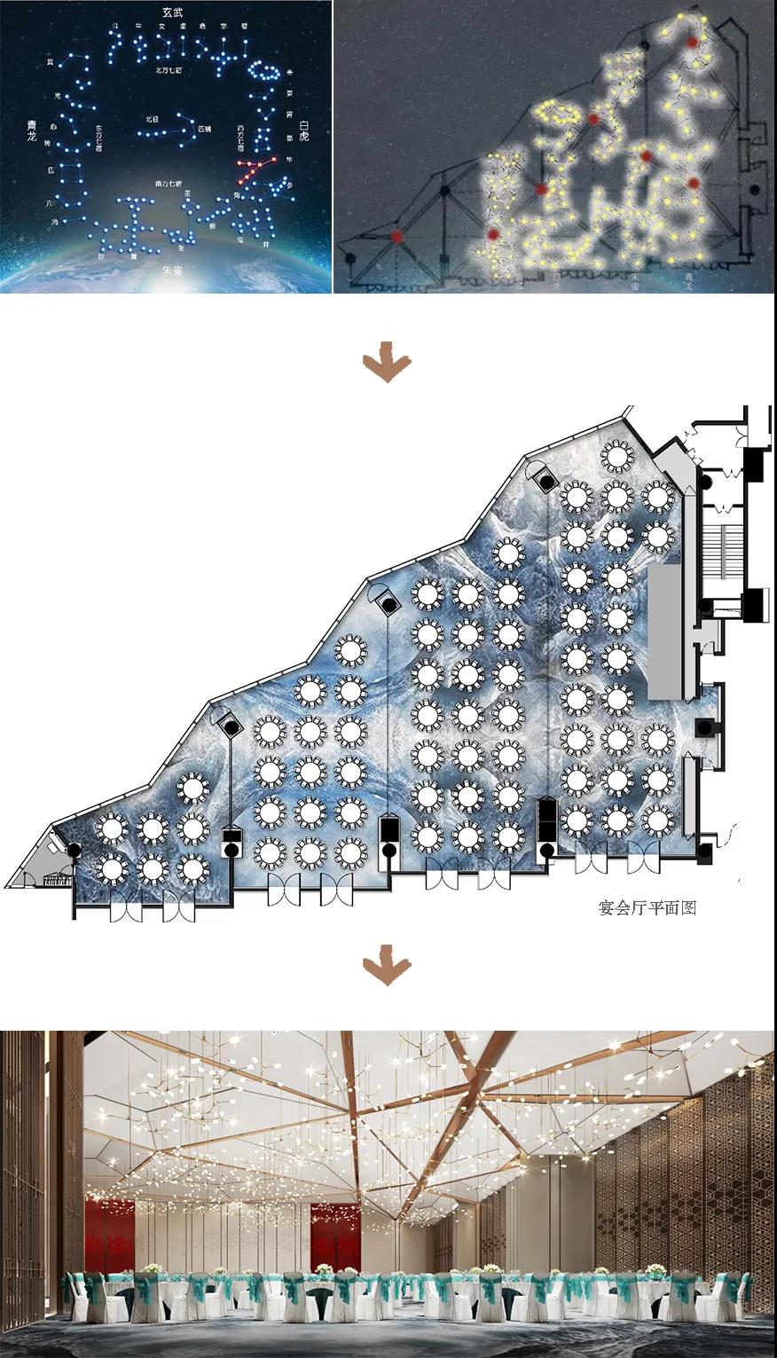 吊顶设计以立柱为支撑点,向上延展做三角几何切割,营造中式均衡性美学效果。七处主灯围绕楼层核心呈北斗样式分布,界定格局;四方二十八宿副灯呼应列阵,灿若星汉,寓意宾客如群星汇聚,共襄盛举。