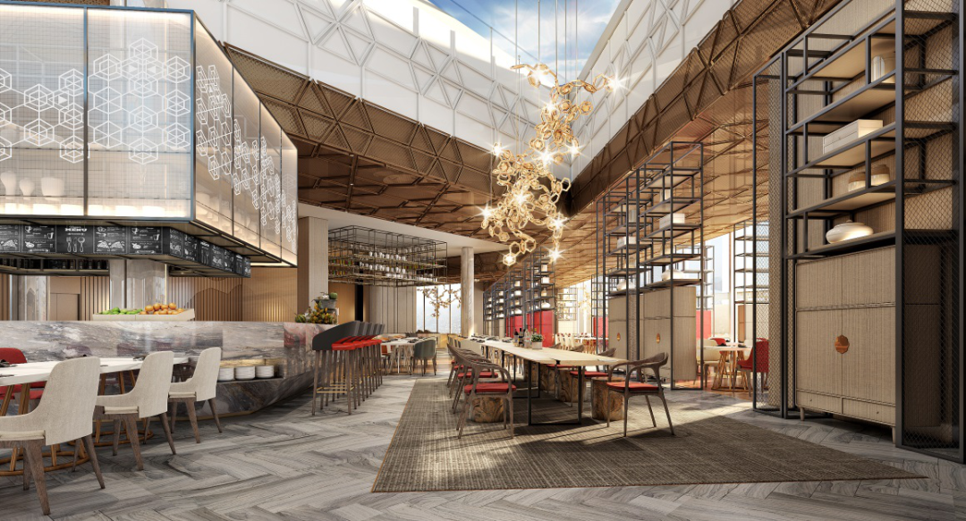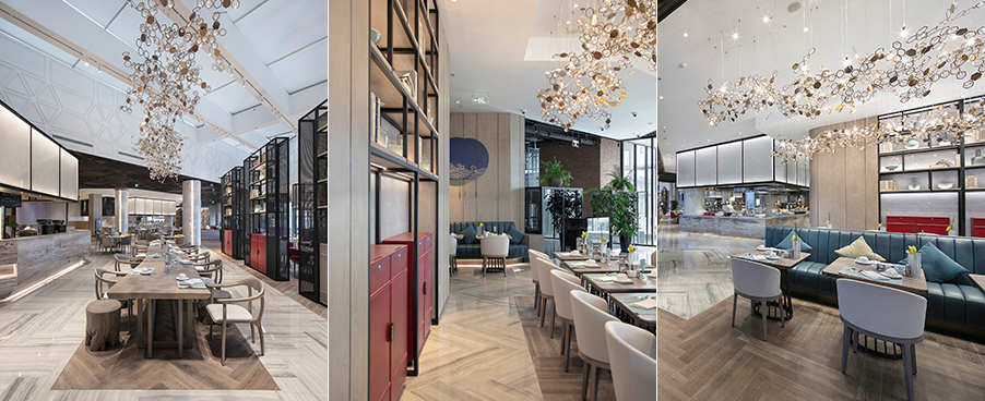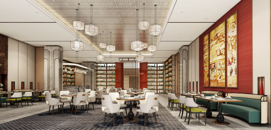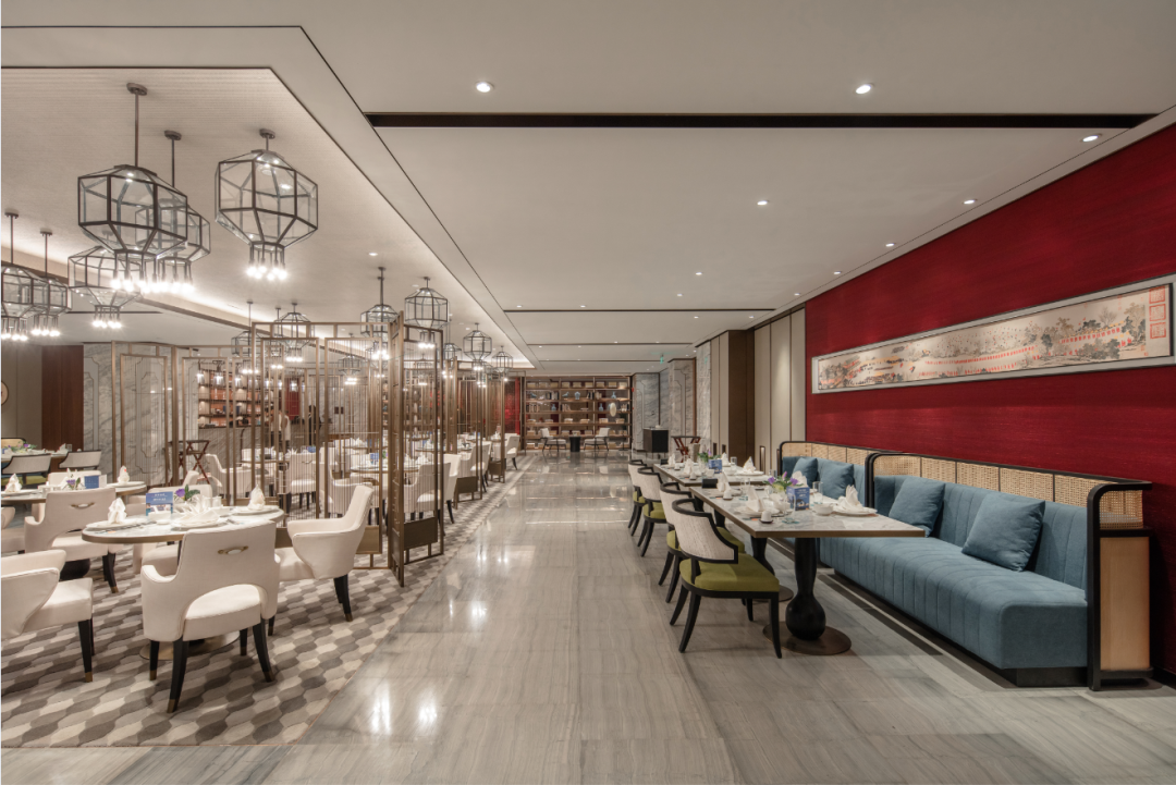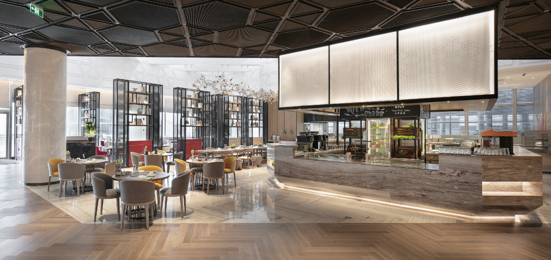 餐饮风格多样化的全日制餐厅,以三角形重构组合来化解异形空间限制,用三交六椀菱重塑顶面与墙沿,借此表达对客人的崇高敬意,也体现了万物融通、东西交汇的空间特质。