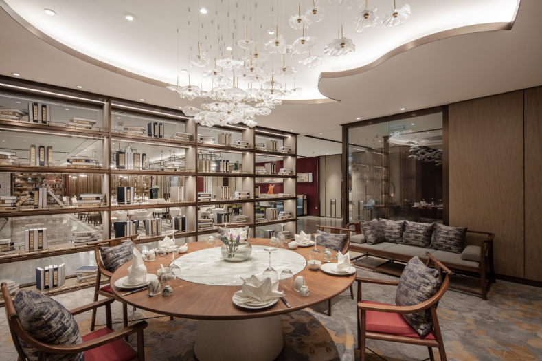 中餐区、日料区、烧烤区、甜品区错落分布,餐桌椅按五行方位配色,御用书架作为隔断点缀其间,层次丰富,时尚趣致,构成美景,呼应美食。