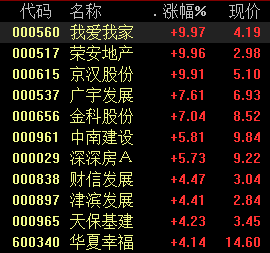 周二午后,地产股持续走高,截至发稿,我爱我家、荣安地产、京汉股份涨停,广宇发展、金科股份涨超7%,中南建设、深深房A等跟涨。
