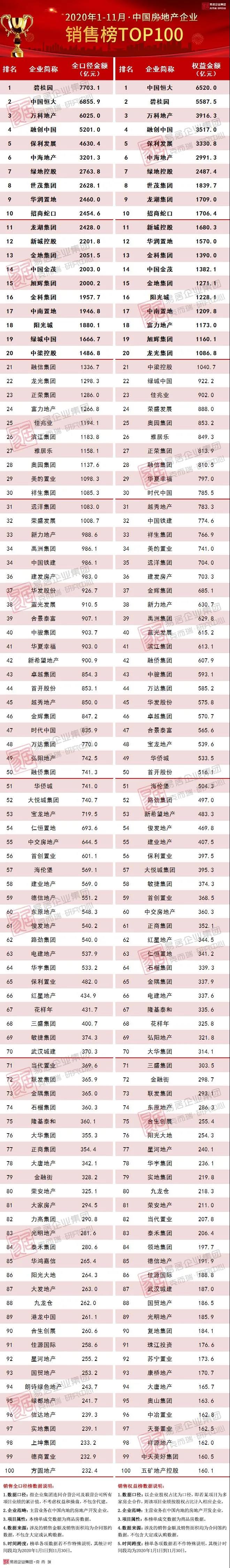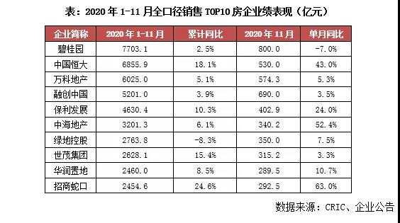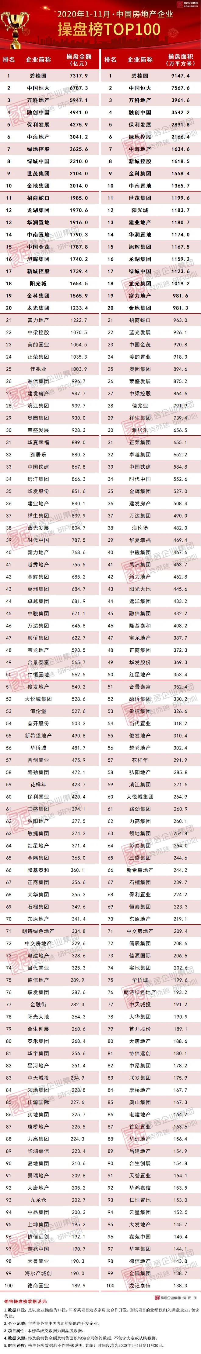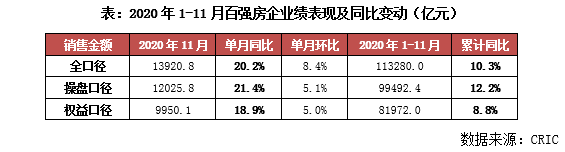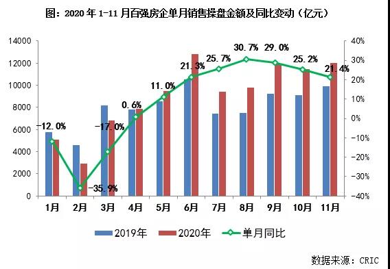 前言: 2020年11月,TOP100房企单月操盘销售金额环比增长5.1%,同比增速自8月的高位逐月回落至21.4%。截至11月末,已有超6成房企接近完成全年目标,部分房企完成率低于85%。整体来看,考虑到目前市场整体的下行压力犹存、去化率承压,12月房企仍需加紧推货、加强营销以冲刺全年业绩目标。