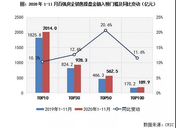 2020年1-11月,百强房企各梯队销售金额入榜门槛同比持续提升。其中,TOP10房企操盘金额门槛达到2014亿元,同比增幅达10.3%。TOP30和TOP50房企操盘金额门槛也分别提升12.6%和20.6%至928.3亿元和562.5亿元,规模房企竞争优势凸显。另截至11月末,TOP100房企操盘金额门槛达到189.9亿元,门槛增速为11.6%,较去年同期也有明显提升。