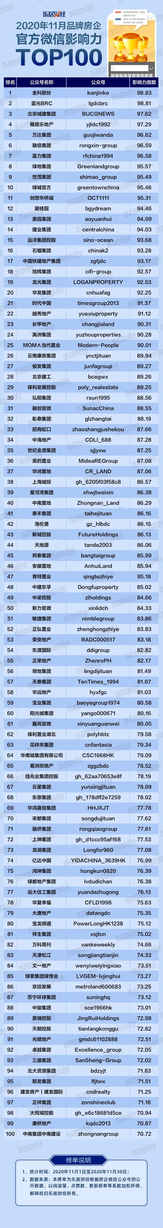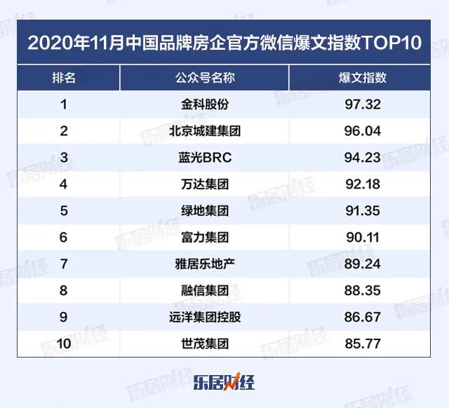 2020年11月品牌房企官方微信影响力TOP100中,金科股份蝉联榜首,其在传播指数和爆文指数方面更是表现不俗,均位列前三甲;蓝光BRC位列亚军,较上月提升2个名次;北京城建集团跃升6名在总榜中位列第三。