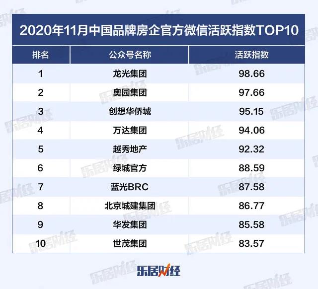 11月品牌房企官方微信活跃指数TOP10中,龙光集团、奥园集团、创想华侨城保持高推送频率,位列前三甲。第四到第十分别为:万达集团、越秀地产、绿城官方、蓝光BRC、北京城建集团、华发集团、球王会体育在线。