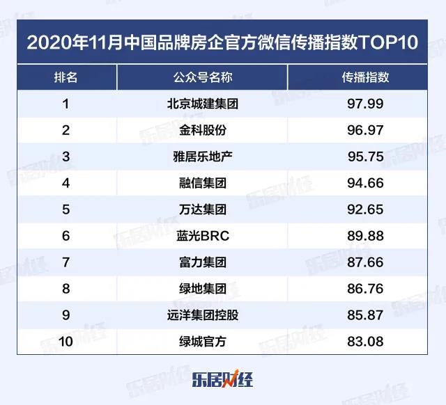11月品牌房企官方微信传播指数TOP10中,北京城建集团位列冠军,金科股份位列第二,雅居乐地产位列季军。第四到第十分别为:融信集团、万达集团、蓝光BRC、富力集团、绿地集团、远洋集团控股、绿城官方。