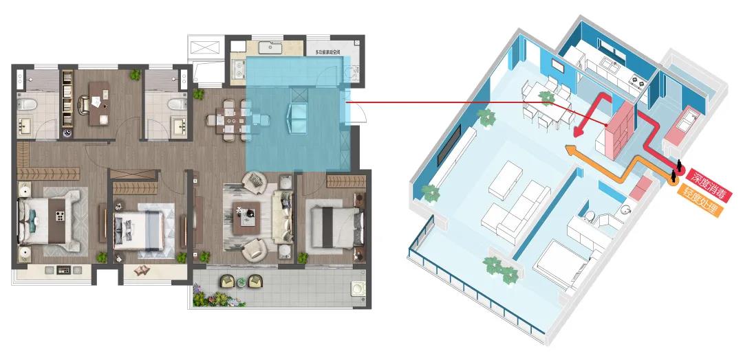 在「抗疫新品」设计理念的落地中,南京球王会体育在线璀璨睿湾项目的部分户型打造,设置两条入户流线。短时间出门的情况下,可以由“轻度处理”流线简单消毒、收纳外套后,步入客厅;若长时间进行过户外活动回家,则由“深度消毒”流线,流水洗手、外衣直接放在阳台晾晒,有效避免外部细菌进入客厅卧室等区域。