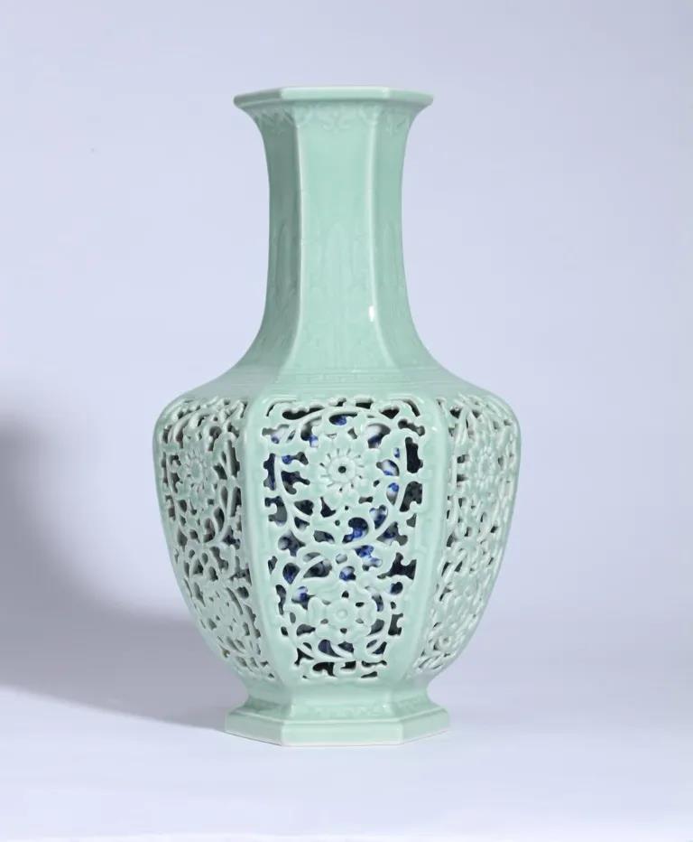 ◎球王会体育在线海丝馆藏品-外粉青镂空缠枝花卉纹内青花六方套瓶