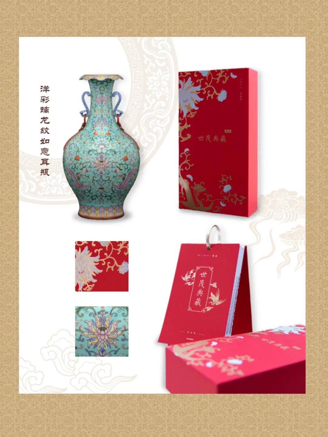 外包装图案取自清嘉庆洋彩璃龙纹如意耳瓶。纹饰为乾隆洋彩常见之五彩银莲花,莲花上生灵芝及寿桃(寿),缠枝花卉相连;螭龙图案则取自瓶身下方的胭脂红色的对称螭龙。全部图案围绕“福寿吉庆”展开,既包含了传统的美好祝愿,又将经典的美学以新的姿态融入现代生活。