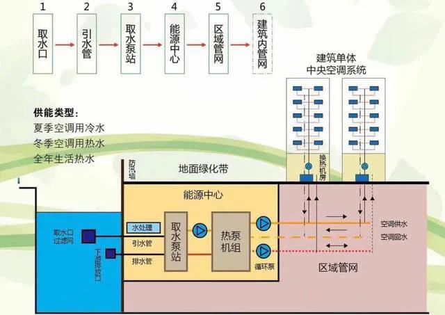 由于地表水相对环境温度具有冬暖夏凉的特点,当冬天需要制热时,会从地表水中提取热量再释放到空调水或生活热水中,夏天制冷时则将空调冷冻水中的热量排放到地表水中。