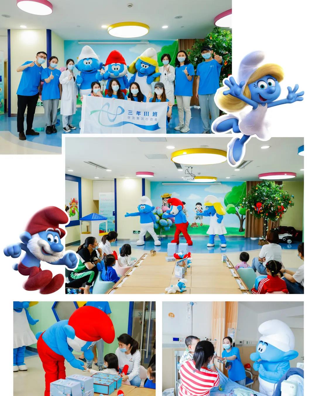 5月19日,上海儿童医学中心“眼镜哥哥”魔法剧场公益空间迎来了一群新朋友,从上海球王会体育在线精灵之城主题乐园走出的蓝精灵伙伴们,为大病患儿带来了丰富多彩的公益活动,送给大病住院患儿们温暖。