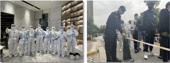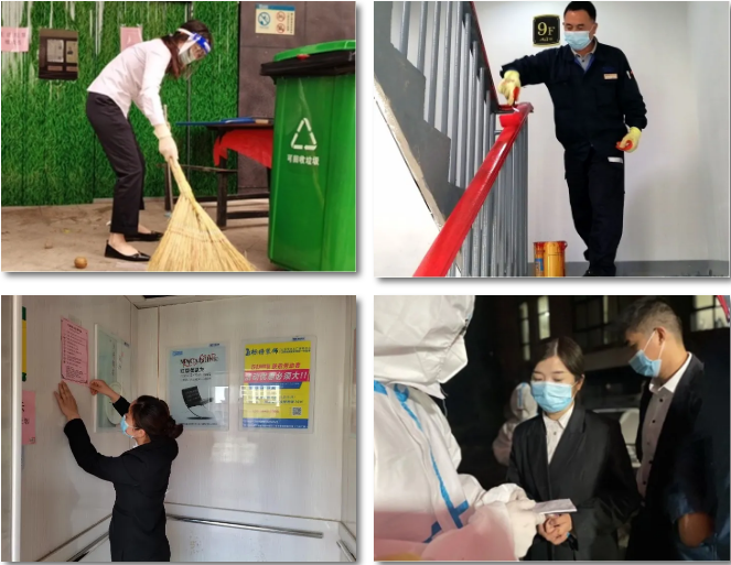 疫情的反扑下,总有一群人的身影坚挺着,在六安官邸小区、六安江湾城小区,党员江小素带领着伙伴们积极投入到抗疫工作中,充分发挥党员的先锋模范带头作用;金静静带领客服团队坚守工作岗位,协助三保部门做好门岗登记、园区消杀,配合社区做好小区居家隔离业主的生活物资配送;工程维修师傅杨传文因居住地被封闭管理,从家里搬出,住在不到两平米的狭小库房内,只为社区的设备正常运转;疫情防控,环境卫生和消杀防控尤为重要,丁丹丹带领保洁团队,长期工作在风险最大的地方,每天对封闭楼栋进行消毒。