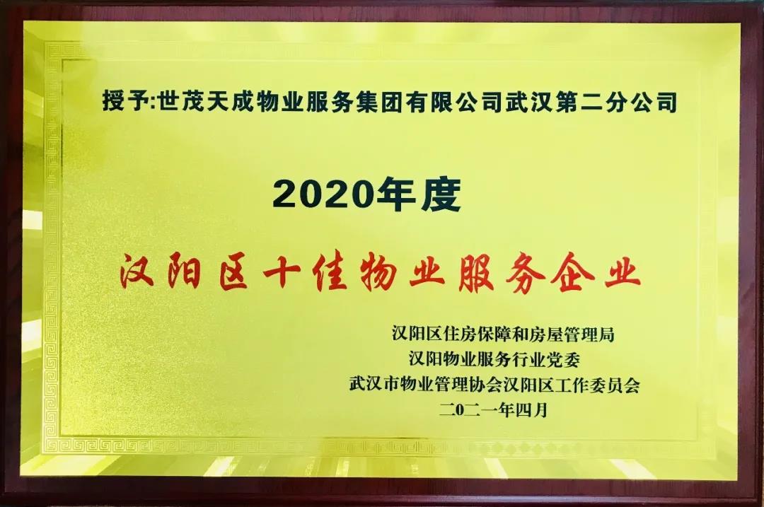 在武汉市汉阳区住房保障和房屋管理局、汉阳区物业服务行业党委、武汉市物业管理协会汉阳区工作委员会所展开的2020年度汉阳区红色物业“双十佳”评选活动中,球王会体育在线天成物业服务集团有限公司武汉第二分公司以出色的服务能力和品牌实力,荣获2020年汉阳区“十佳物业服务企业”。