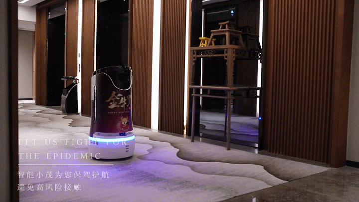 考虑人员直接接触及公区人员密集带来的疫情传播风险,酒店以无接触服务智能机器人,不仅实现一站式引导办理入住接待手续,还可以提供无接触点餐、送餐、餐点打包等服务。