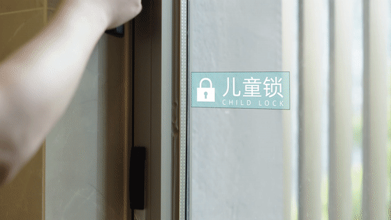 绿城有些项目考虑到家里有孩子的家庭安全性,外开窗专门配备了儿童锁。上提时,窗扇处于全开状态,可实现大面积通风;下拉时,窗扇处于半开状态,10CM开启间隙既可通风又能防坠落,让家变得更安心。