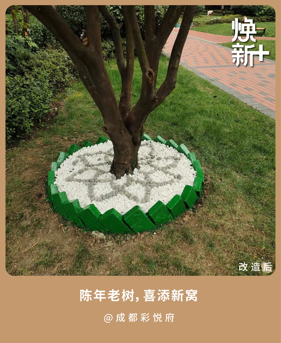 成都彩悦府在对社区进行道路维护时,也不忘帮树木搭建新家,使它无惧风雨的侵袭,以更活力、茂盛的姿态,陪伴业主们度过漫长岁月。