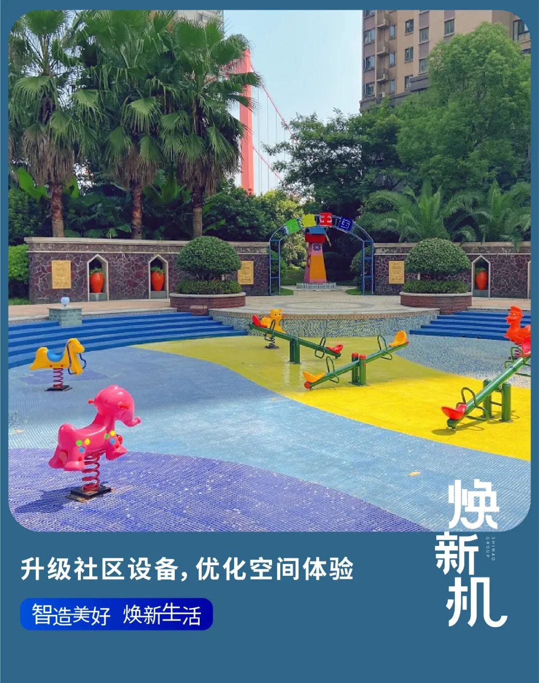 以品质迭新社区空间,为优化社区空间功能体验,社区焕新从硬件设施着手,不断改善娱乐设施设备少、休闲座椅破旧等情况,新增友好便利设施,且对社区区域设施进行升级改造,让身边老地方,常有新感觉。