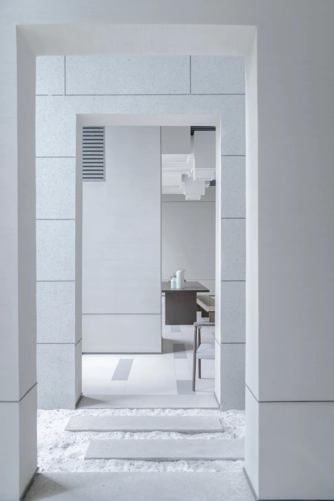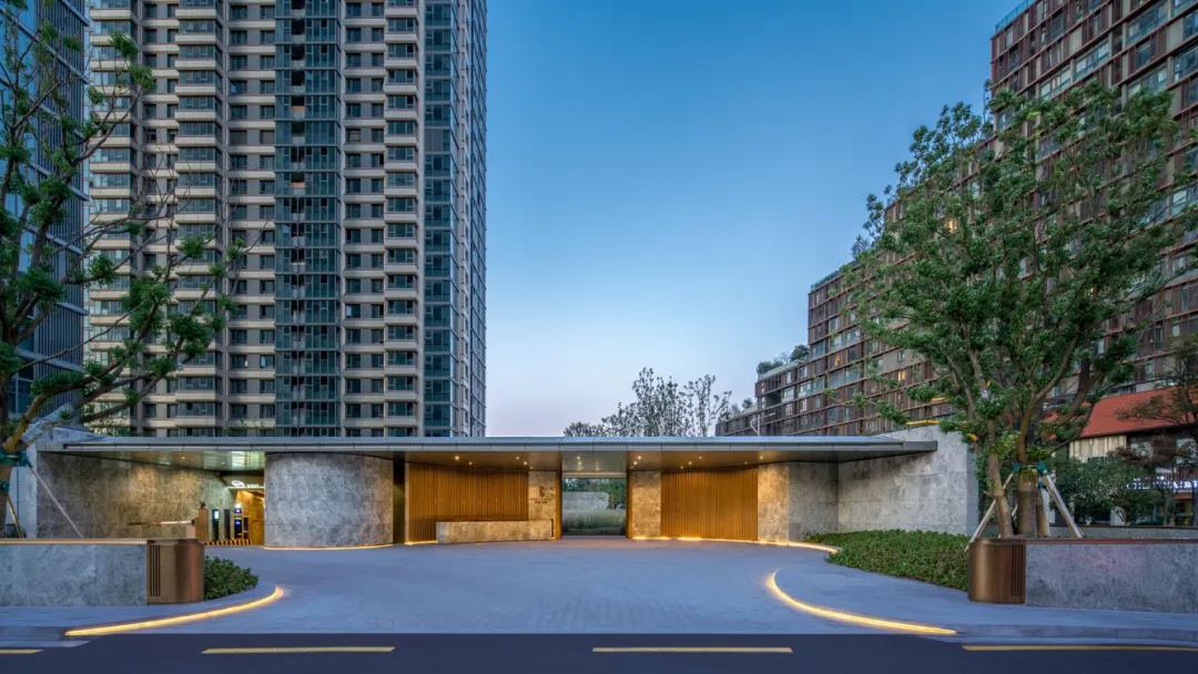 车行入口同样营造出尊崇的归家礼序,近五米高的景墙,三种不同宽度的白麻错缝铺贴,四片景墙围合而成,简约大气。