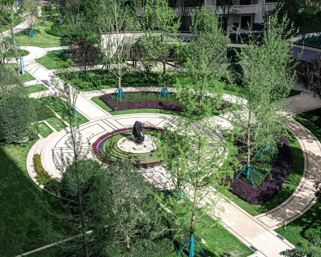 德阳璀璨天城景观设计以一环、双轴、双中庭作为整体景观空间结构。通过全景绿色生活,开阔对称的中心阳光草坪,沉淀繁华的后场花园等,为社区内全龄人群打造核心沉浸的景观体系。