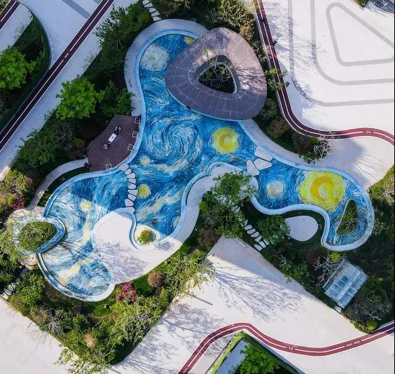 济南球王会体育在线璀璨悦府的景观融入梵高的《星月夜》作品灵感,提取星空图案和自然生命的元素,用颜色自然的热熔马赛克进行铺贴,最终形成璀璨星空艺术水景,让生活本身变成艺术,创造出浪漫艺术的生活场景。