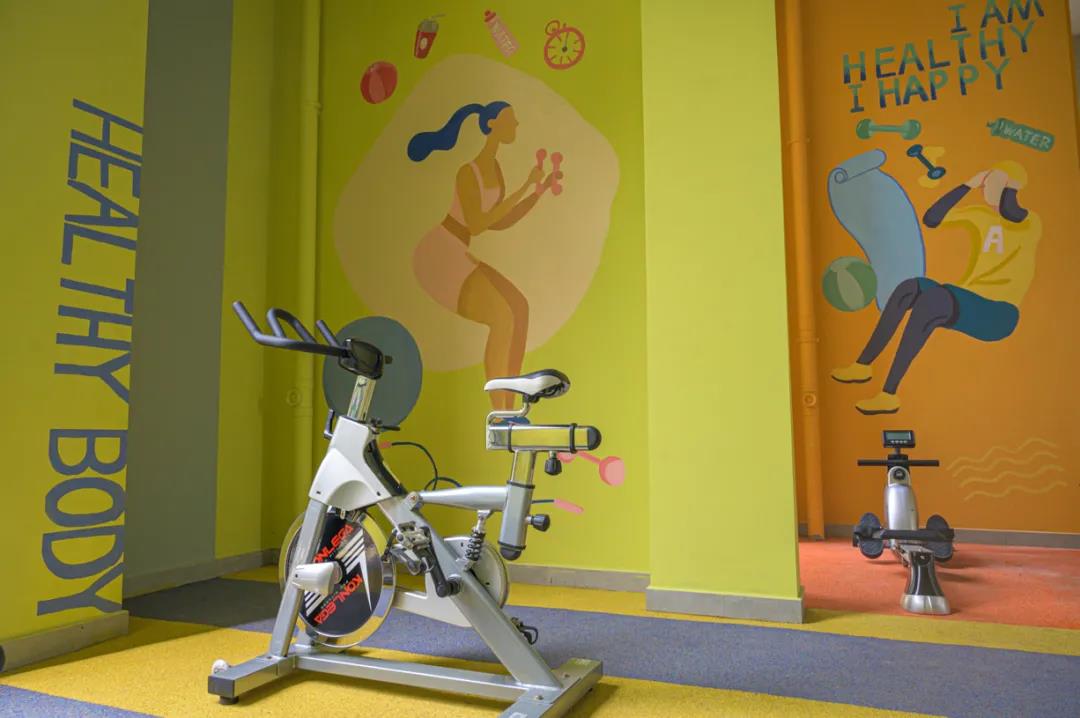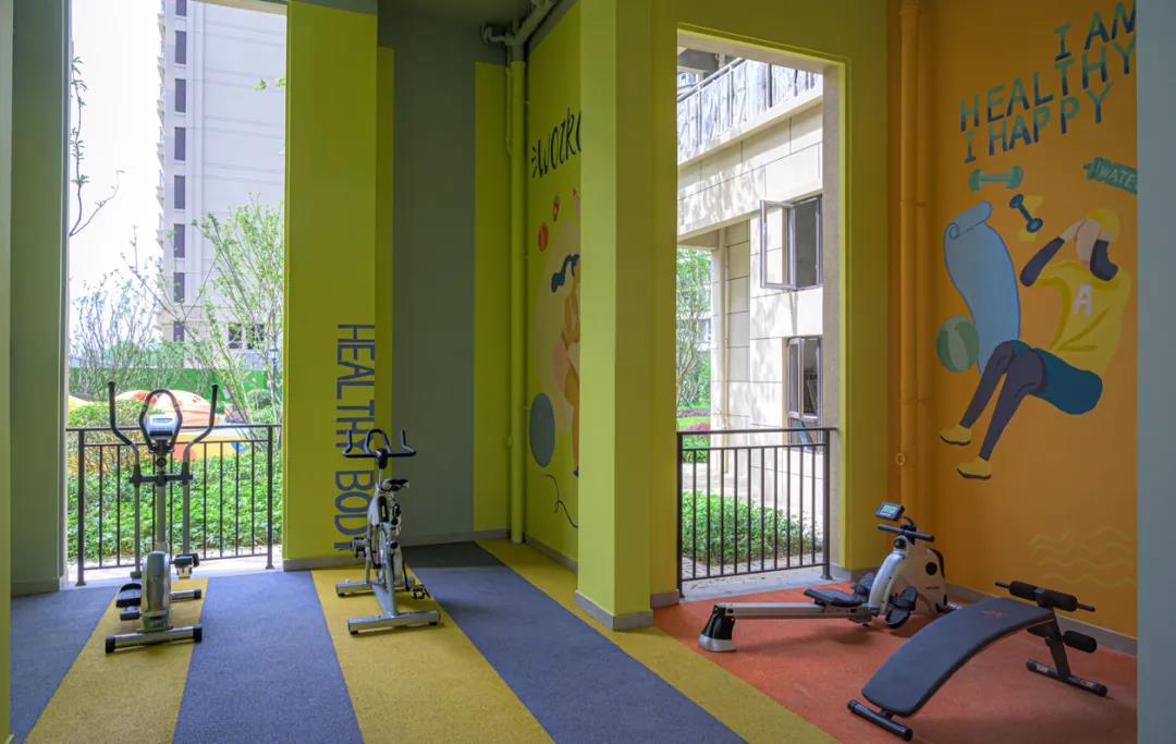 通过架空层的空间利用,让美好与居家活动深度融合。成都球王会体育在线璀璨里以健康运动为构思,将架空层变成社区健身会所,在协调缤纷的色彩里释放活力,随时可与老友在动感单车上来一场耐力比拼。