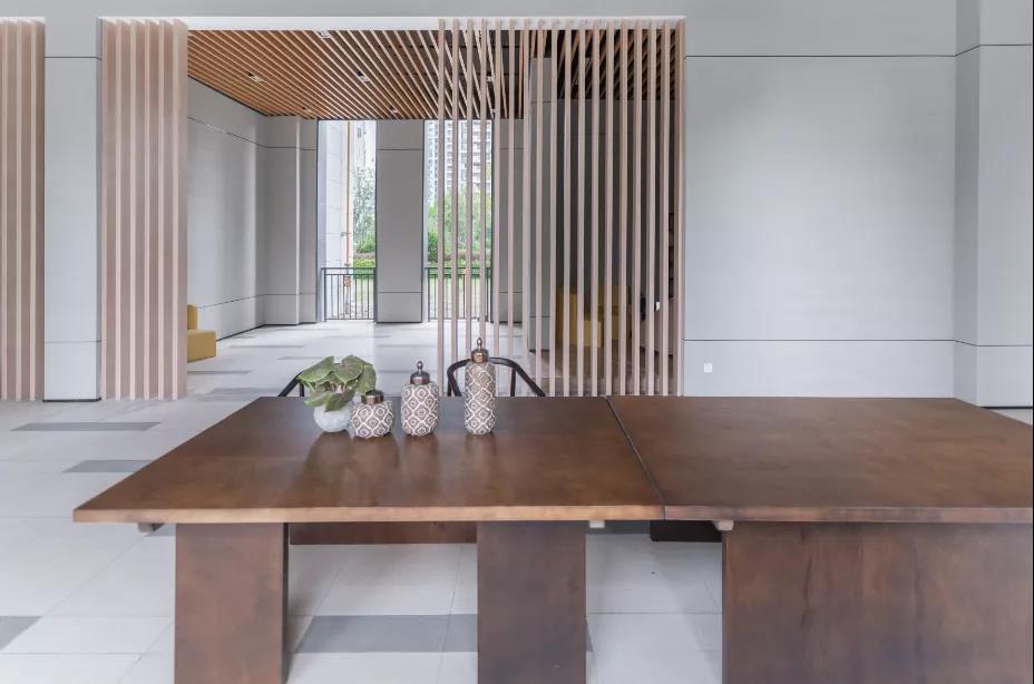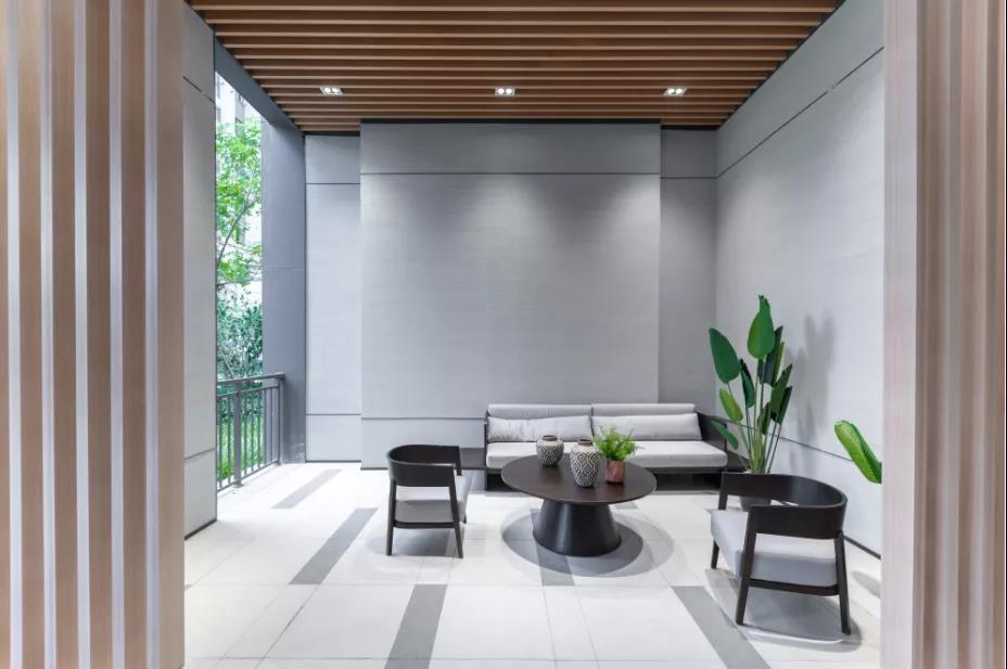 温州中央悦府的架空层以浅色涂料+浅色地砖为基调,构建的半开放式棋、茶、书、画空间,最大化引入室外光线和自然景观,让人们在风雨天也可以下楼进行社交休闲。