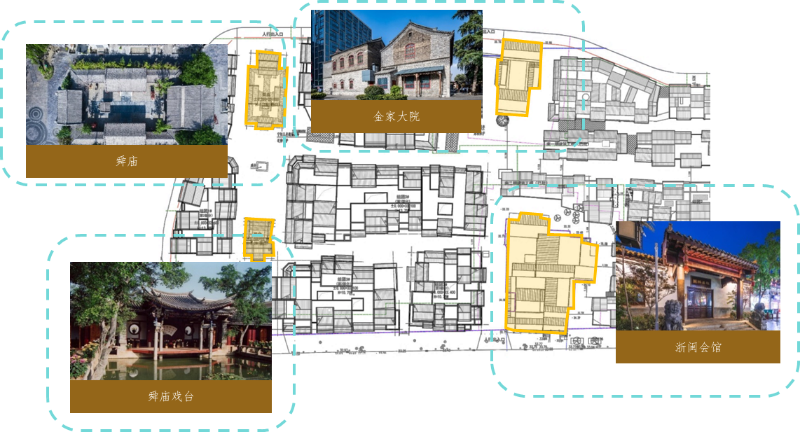 新建组团在总平面设计时均对历史建筑做适当退让,在历史建筑周边形成相对开阔空间。将历史风貌融入项目中,同时实现文脉的延续和现在商业功能。