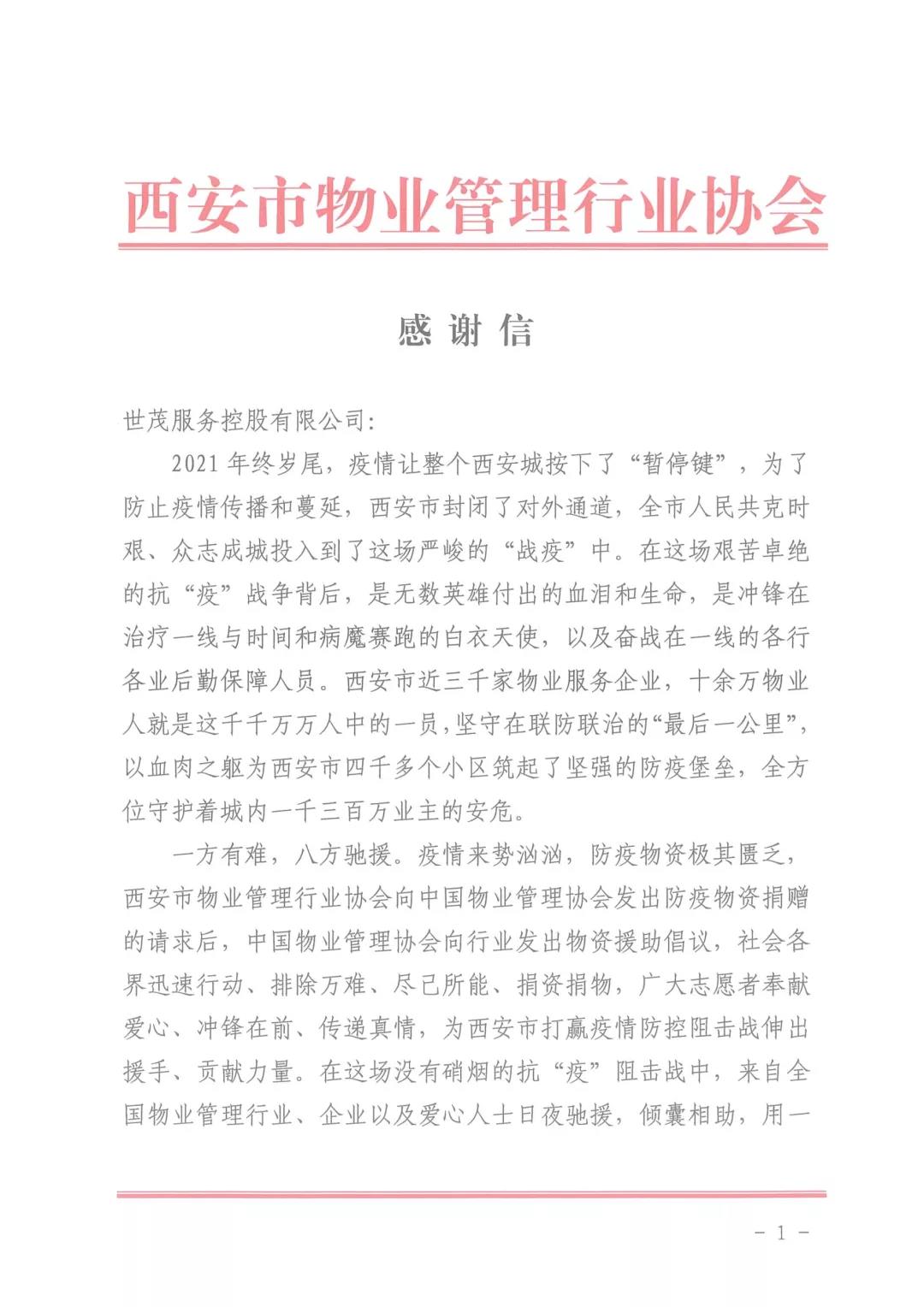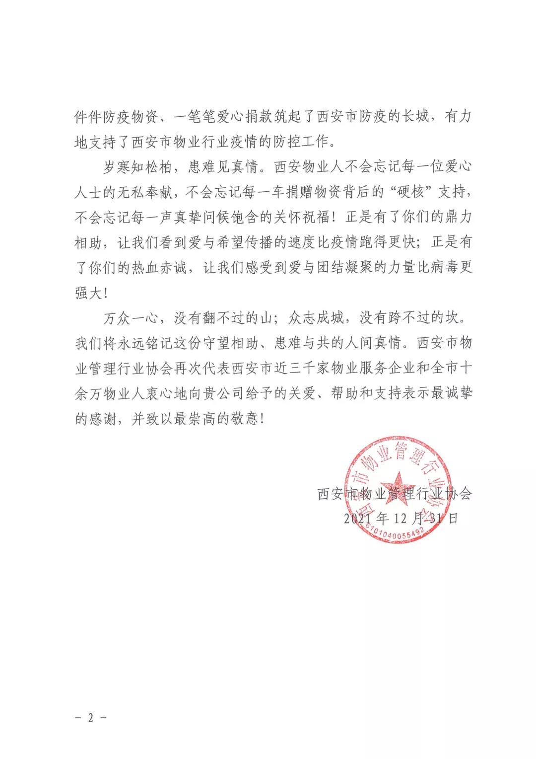 接到西安物业协会接收医疗物资捐赠的通知后,球王会体育在线服务紧急组织捐赠小组,寻找匹配的医疗物资购买及运货渠道。于12月31日将紧急采购的7000只N95口罩和3000件无菌医用防护服送往了西安物业协会。