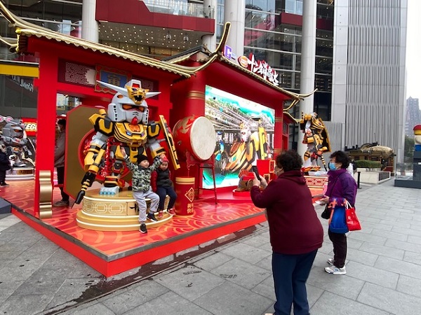 这两天步入上海球王会体育在线广场的南京东路外广场,映入眼帘的是喜气洋洋的“中国红”:还原了东方古建筑的飞檐翘角,高高悬挂在屋檐的灯笼及京韵大鼓等一系列中国元素,还有一群身披“中国风机甲”的十二生肖高达战士烘托出喜庆氛围。