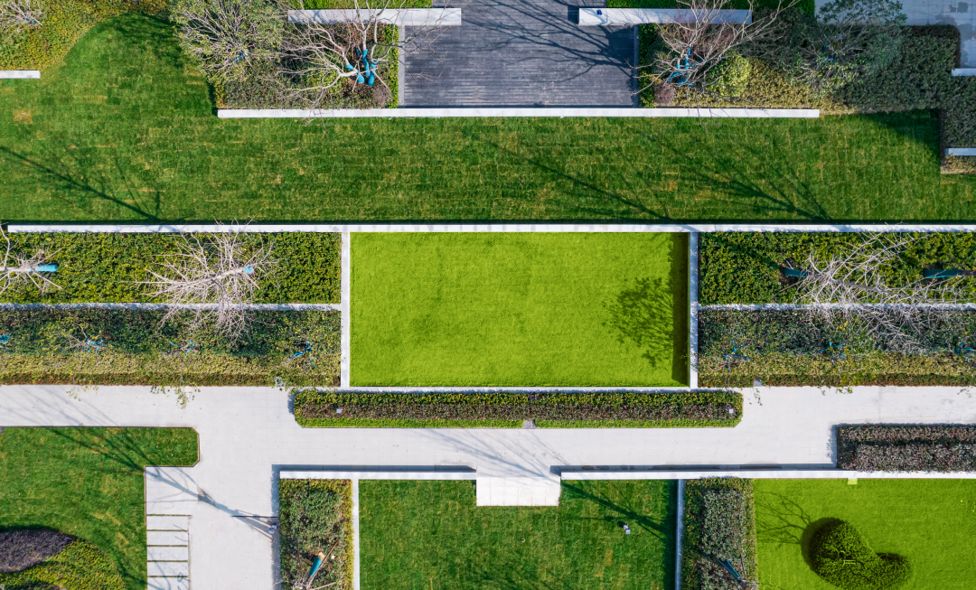 景观花园中,排布了多种功能设置,比如景观漫步道、阳光草坪、室外休憩场所。