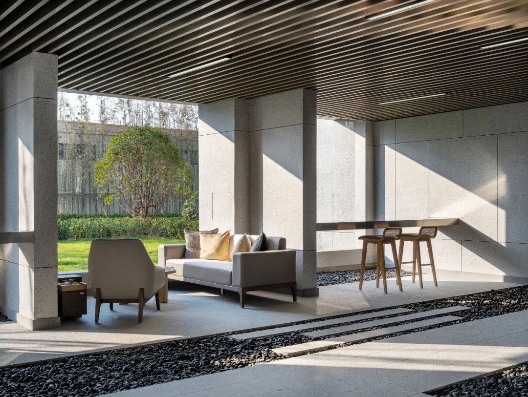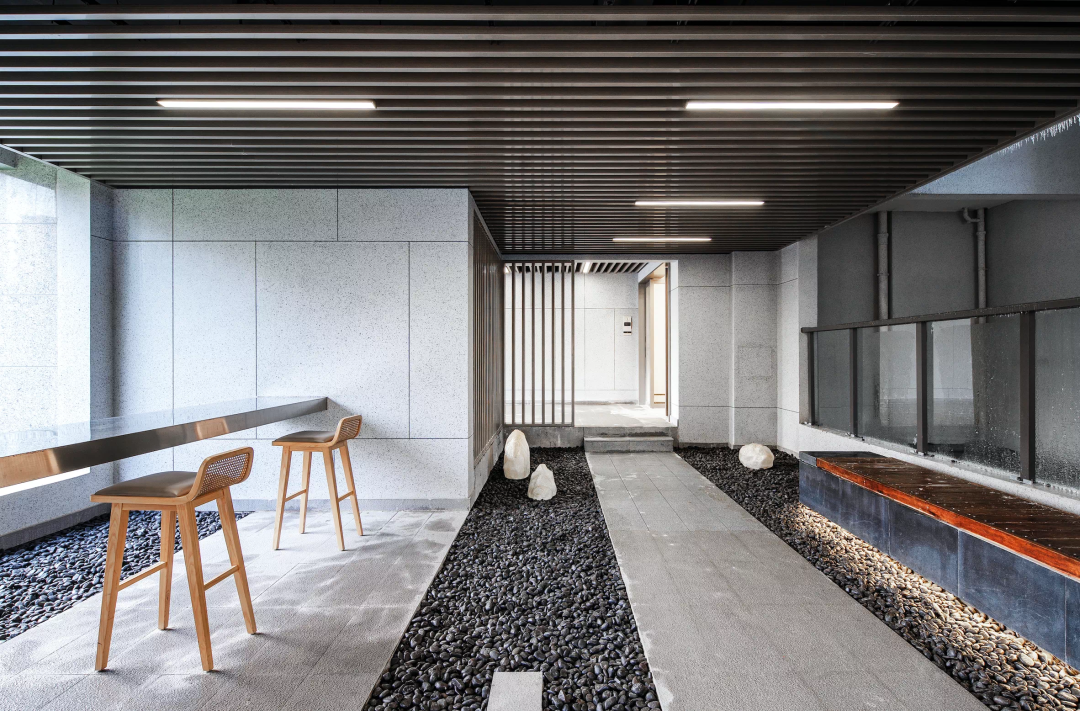 入口处金属材质柱体结构在强调秩序感的同时,又在交错之中流露出灵动的气息。流线灯光与底部水池相呼应,涌动的泉水更能激起人的欣喜,让归家这件事充满仪式感。
