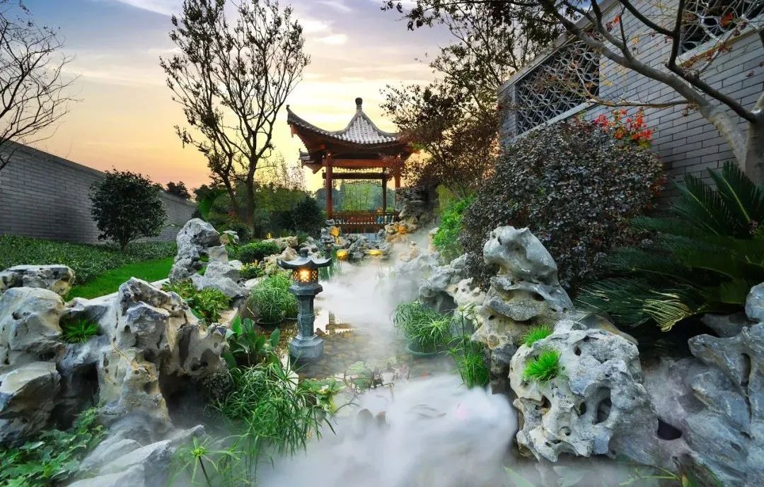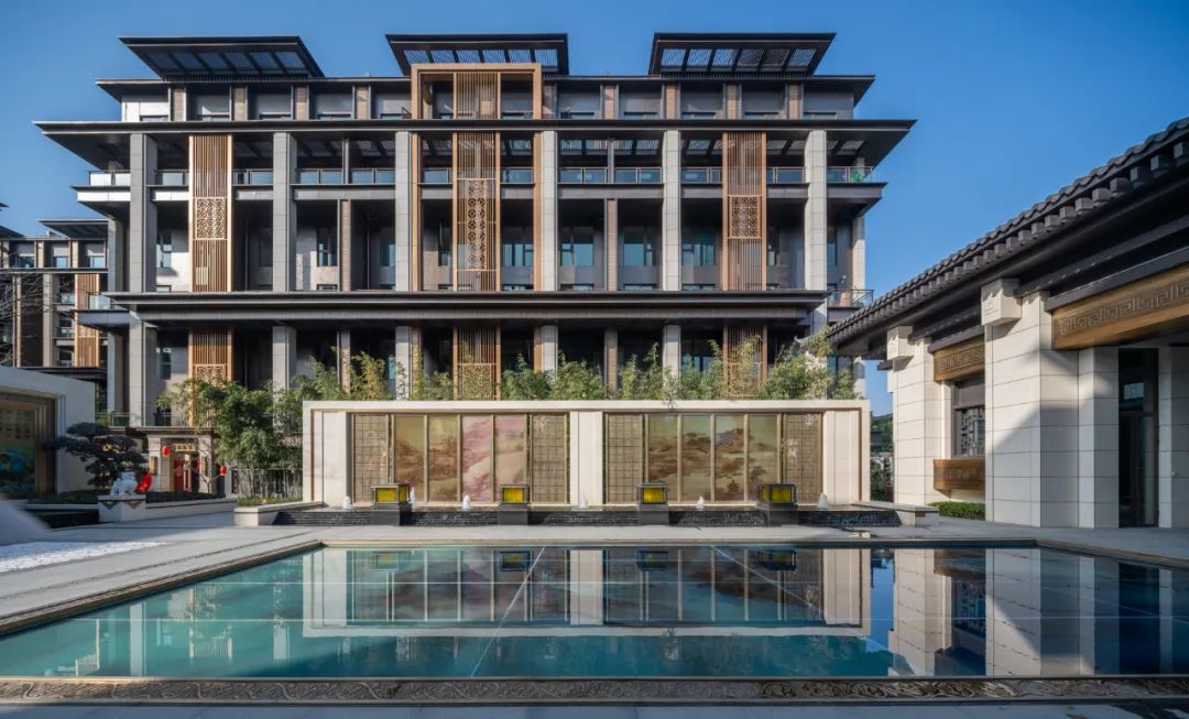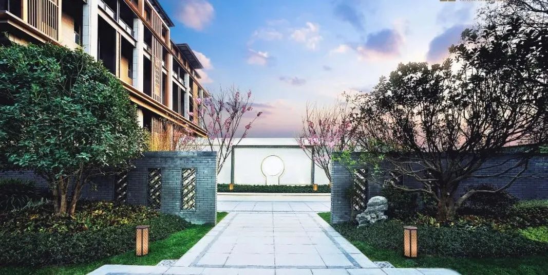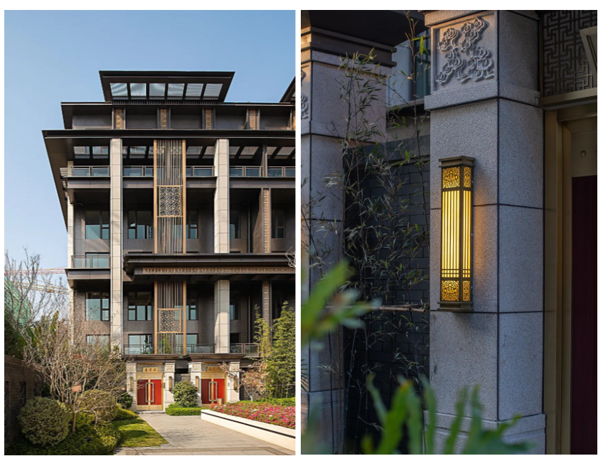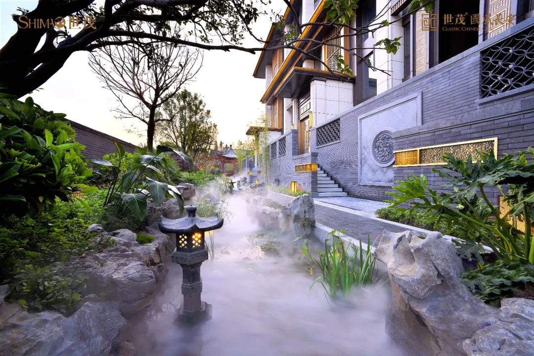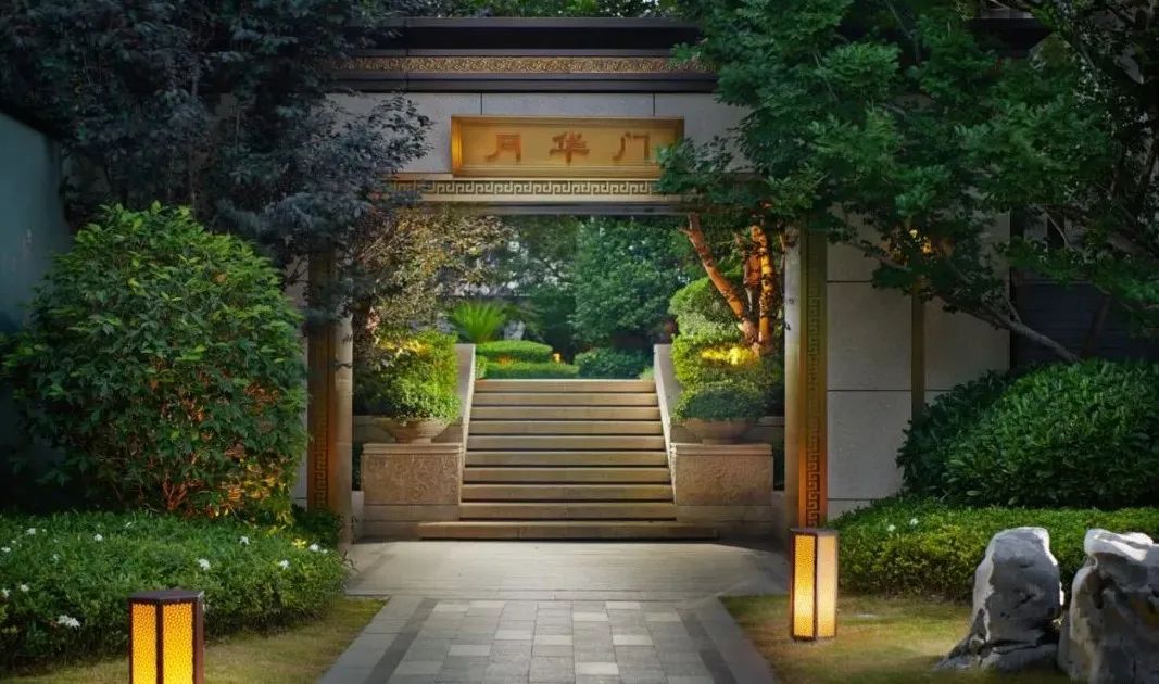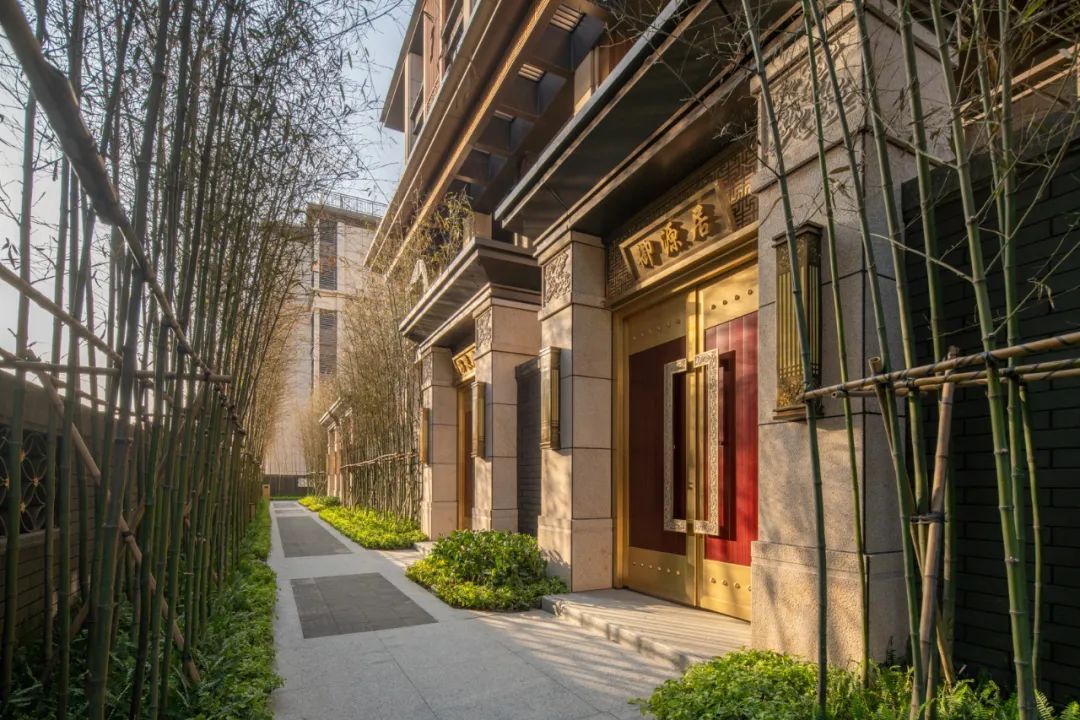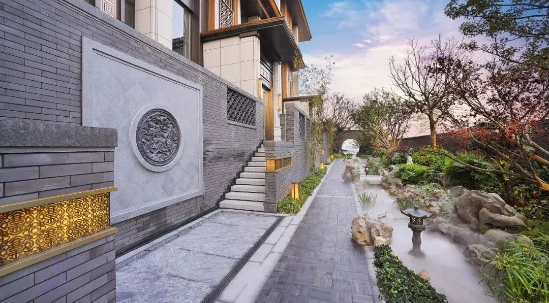 仿铜色金属格栅窗花、定制纯铜匾额、定制铜木门、铜制回纹门钹等元素,将传统国风形制精雕细琢融入生活,几乎每一处细小的雕纹与景观小品,都散发着独具美感而无可挑剔的东方雅韵。