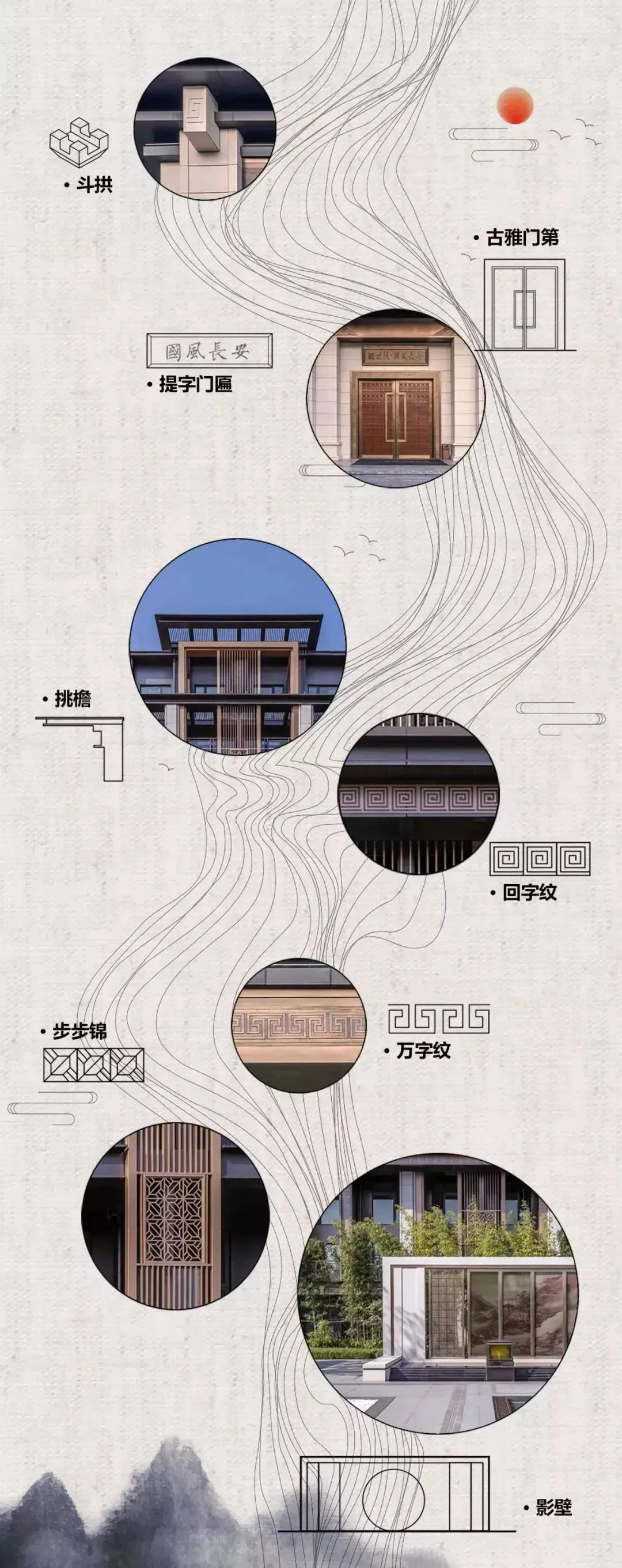 球王会体育在线国风长安汲取汉唐古韵,运用简洁利落的线条,将传统的挑檐、纹样、斗拱、窗花等中式建筑细节与当代优质建筑材质完美碰撞,每个中式符号在这里均转变成为别致的国风系立面造型语言。