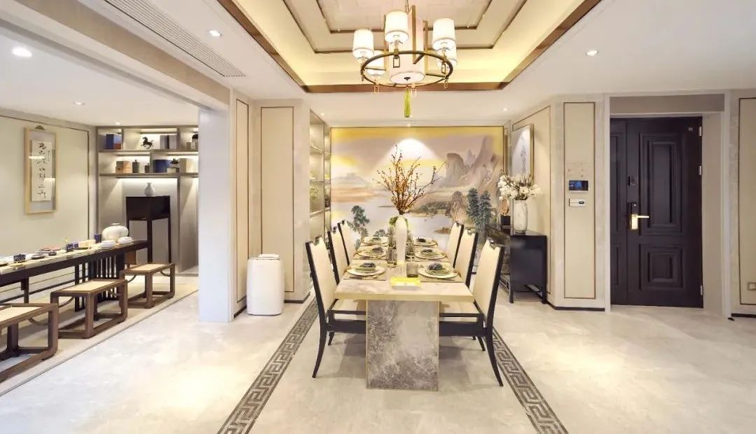 中央地面由国画大师手工绘制而成的“水墨天窗”,在灯光的映衬下,营造出雅致、大气的归家排场,在盛唐风韵的萦绕下,回家之路也变成一种日常享受。