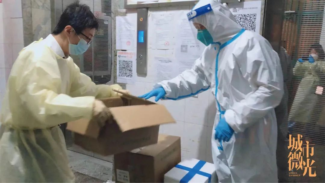4月4日晚上收到政府发放的物资时候,为了尽早让部分物资紧缺的居民收到生活保障,她第一时间下楼,帮助居委把物资一箱箱搬上小货车上,再一箱箱搬到每栋楼下面广播通知、核实信息、分批发放,对于有确诊的楼栋,毫不犹豫做好防护上门送货,确保每位居民在第一时间可以收到物资。