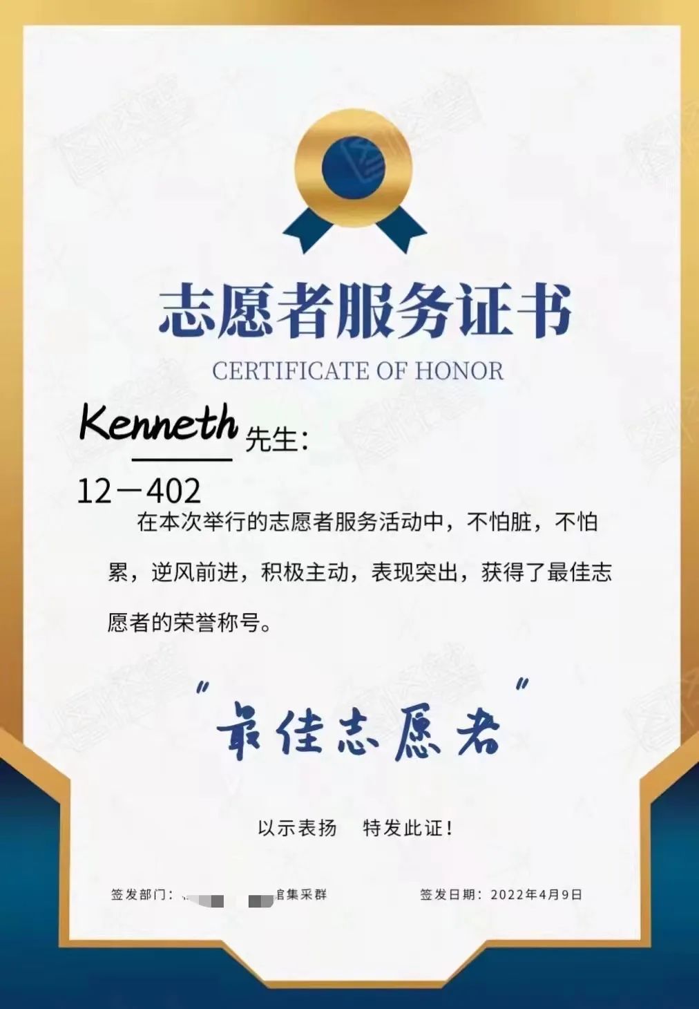 由于物资堆积很多,有活动组织经验的刘昌灯与志愿者小伙伴们有条不紊的对物资清点消杀,有计划、有条理的进行配送,即使如此高效,依然直到凌晨两点多才完成工作。他们的工作不仅得到邻里间的感谢,更收到了来自社区颁发的荣誉证书,看到大家收到物资后欣喜与感谢,对他来说这一切都是值得的。