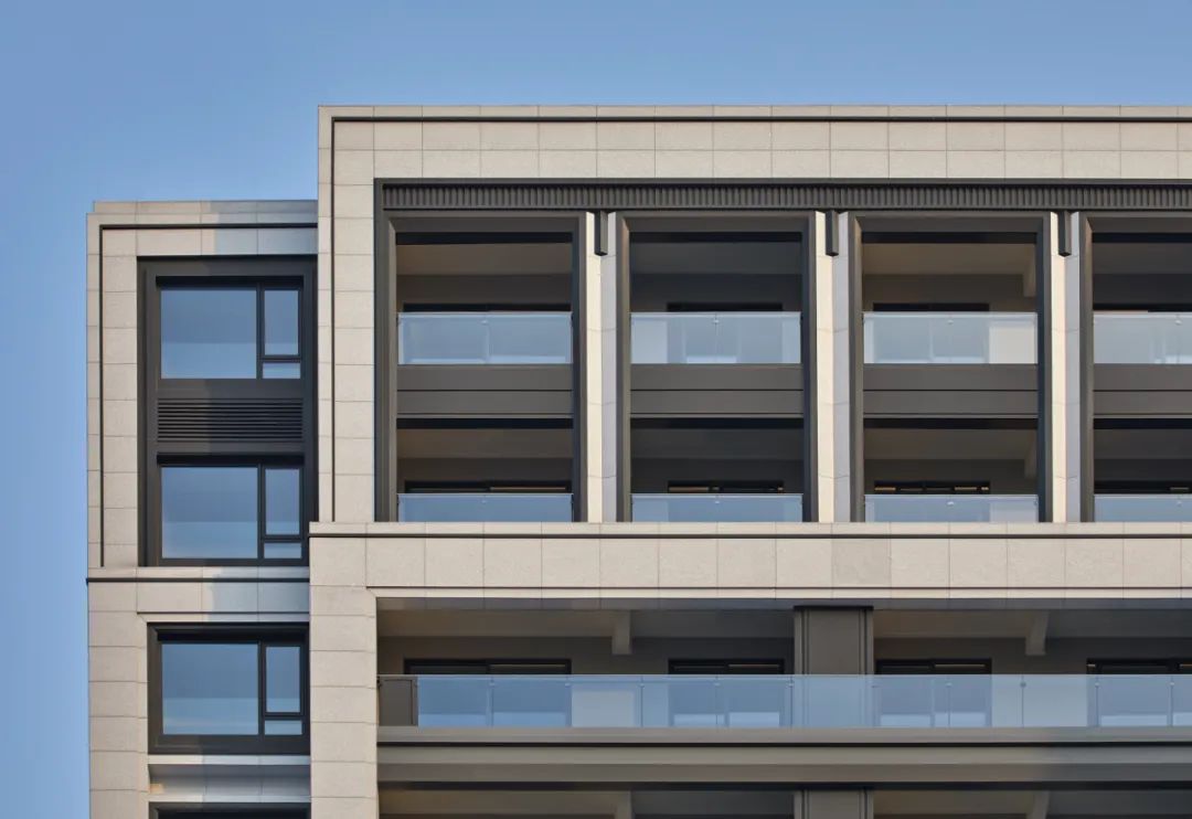 洋房入户立面选定亮面山东白麻石材+浅灰、深灰色氟碳喷涂铝板干挂幕墙体系,其中亮面石材营造出镜面效果,还原了建筑浑然天成,似玉非玉的天然美感。