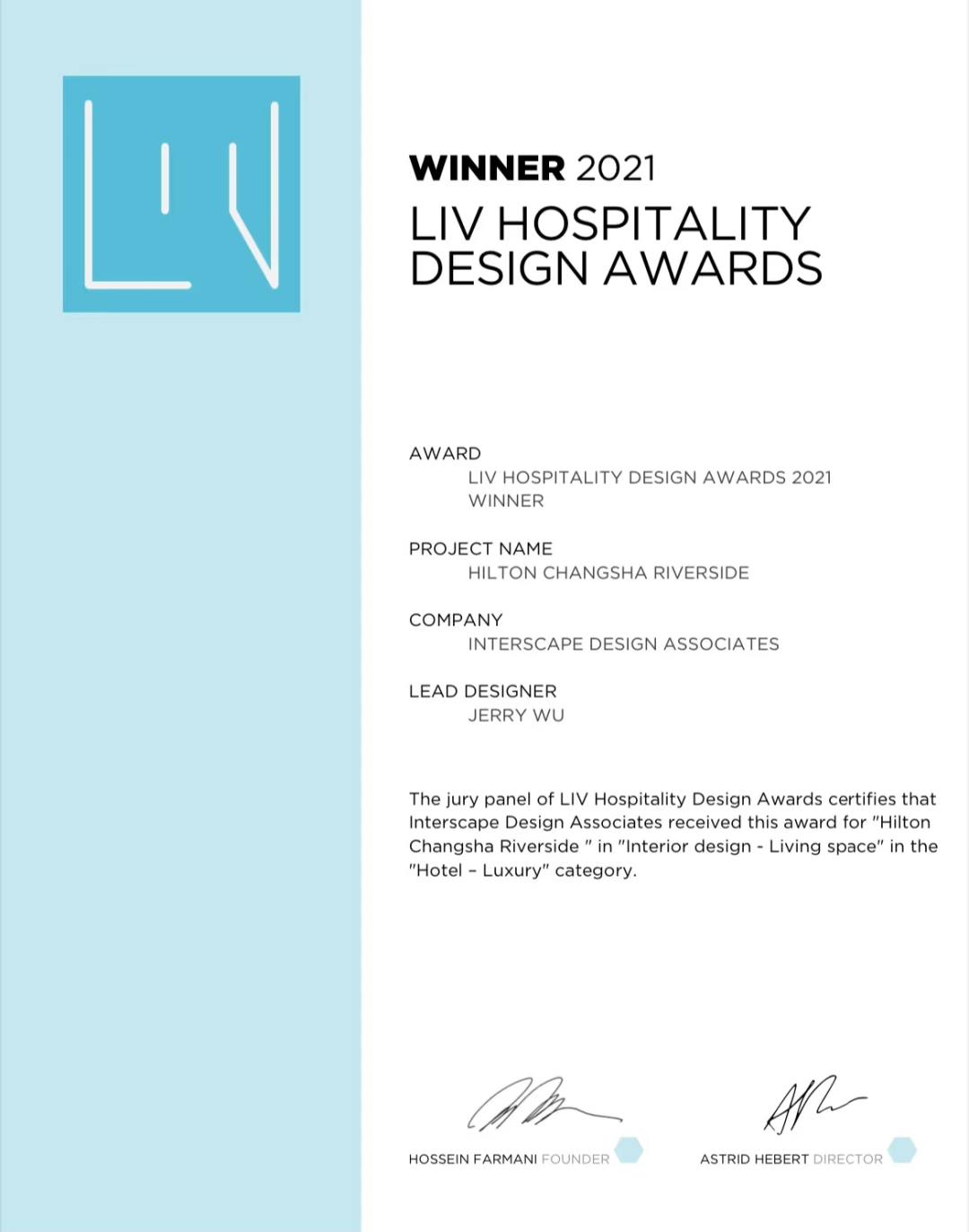 LIV酒店设计奖(LIV HOSPITALITY DESIGN AWARDS)由法玛尼集团(Farmani Group)创设,自1985年成立至今,法玛尼提升了艺术与设计在世界范围内的影响力,成为行业内举足轻重的权威机构。