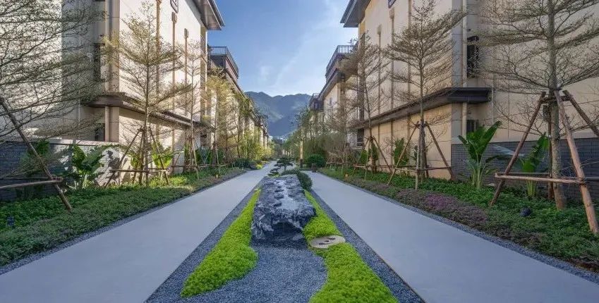 根据小镇起伏的地形,多是采用更为挺拔的乔木品种,打造渐入山林的感受,苍松翠绿树影婆娑的山居观景,仿若静坐山林间,老人练太极,一呼一吸间尽是山野富氧,健康而又富有雅趣。