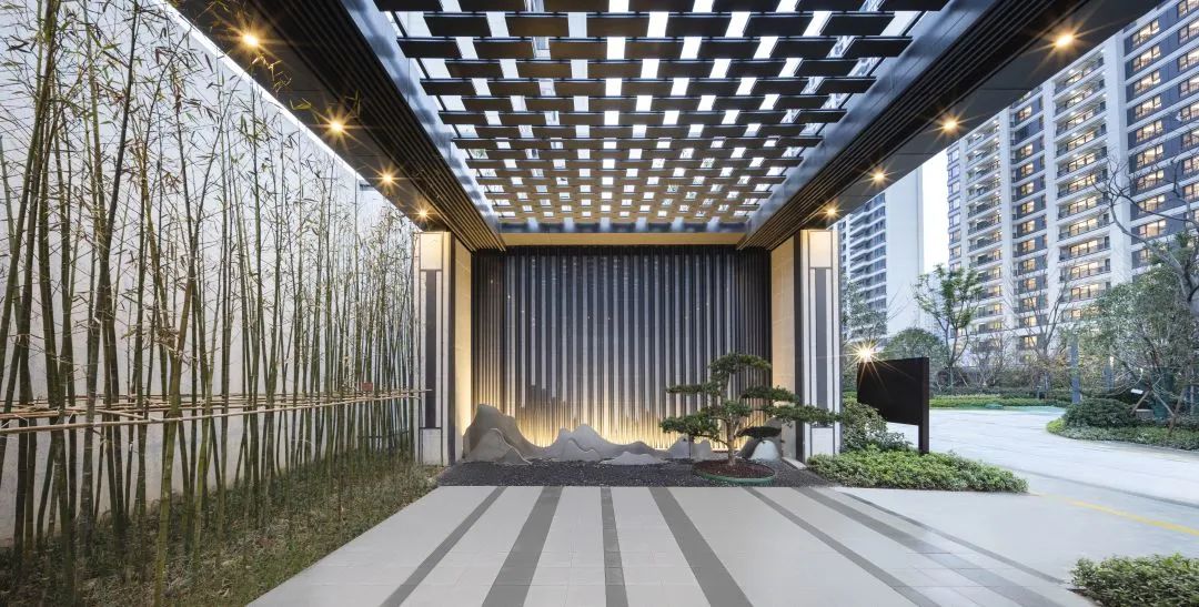 山水风格的照壁搭配浅灰色石砖,营造出心理上的静谧,建立起禅意美学归家之仪。