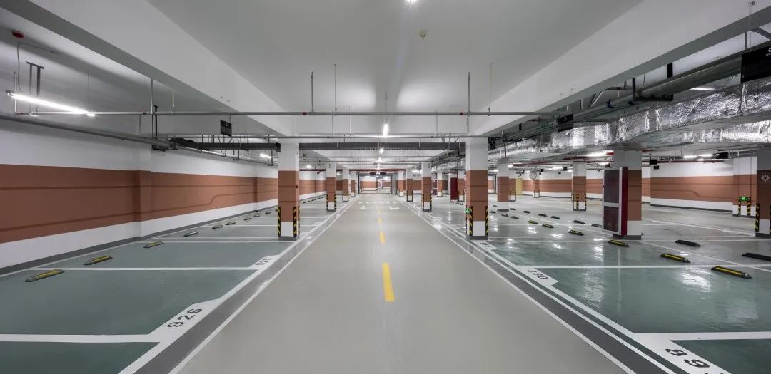 地下车库地面铺设环氧地坪,防腐耐磨,靓丽色彩点缀着地下车库的每一个角落,没有阴暗角,即使深夜归家,也给居者十足安全感。
