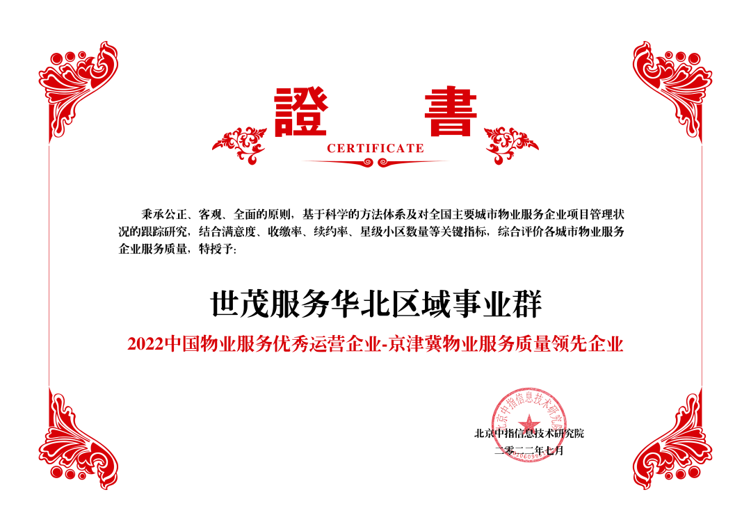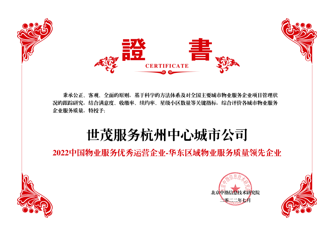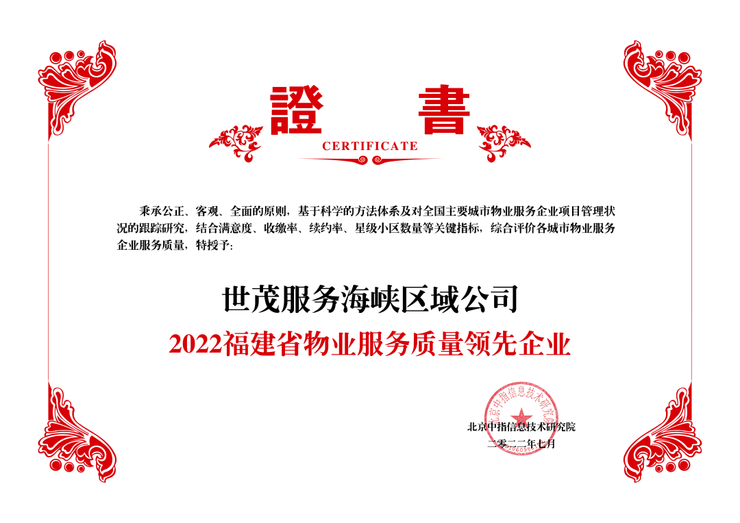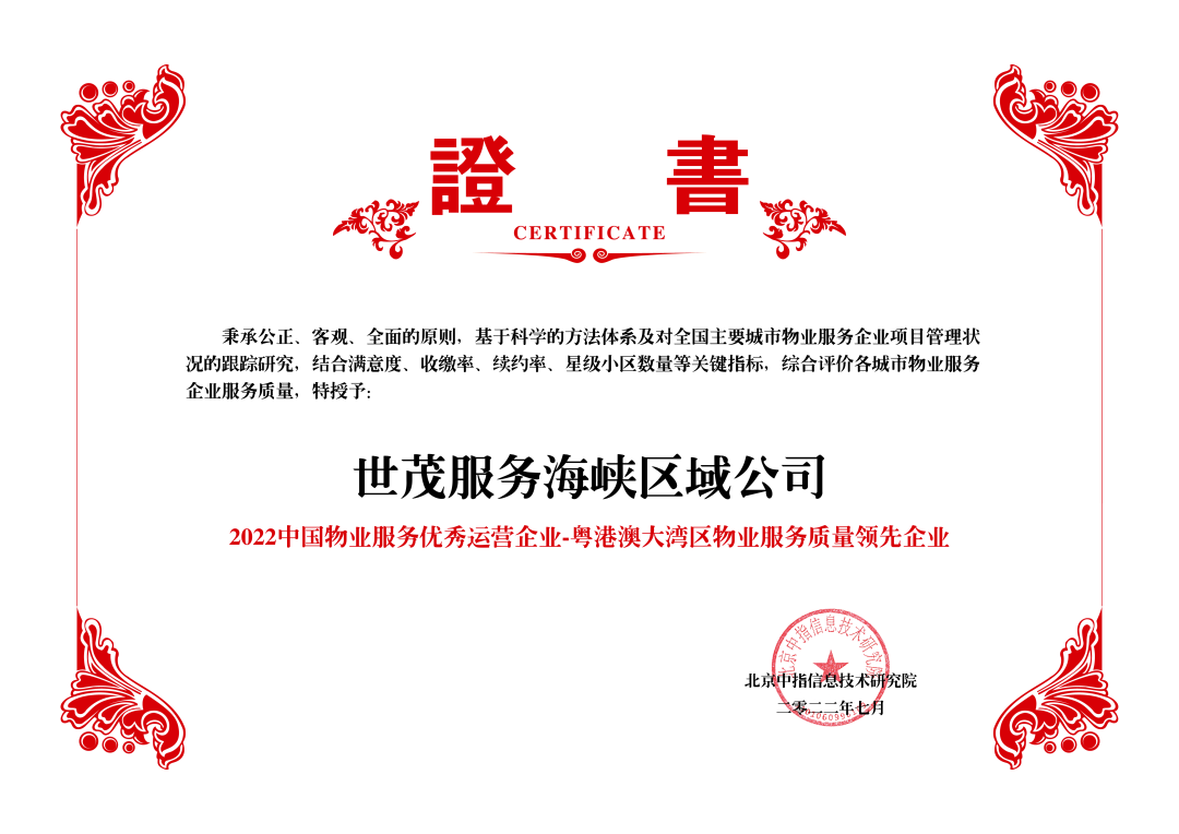 球王会体育在线服务华北区域事业群荣获“京津冀物业服务质量领先企业”称号,球王会体育在线服务海峡区域公司荣获“粤港澳大湾区物业服务质量领先企业”、“2022福建省物业服务质量领先企业”称号,球王会体育在线服务福州中心城市公司荣获“2022福建省物业服务质量领先企业”称号,球王会体育在线服务杭州中心城市公司荣获“华东区域物业服务质量领先企业”称号。