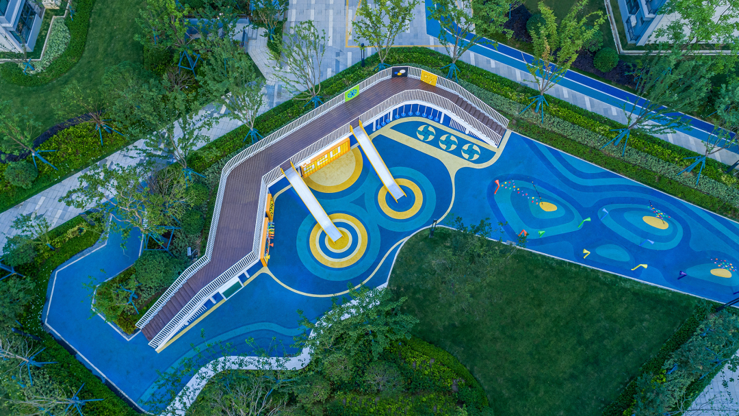 南京水沐云筑以温馨舒适核心景观连廊带,将宅间绿意串联,创造亲近自然的归家之路。色彩艳丽的“稚梦天地”,设有攀岩、滑梯、唱K小喇叭等器材,为孩子们提供释放天性的乐园。