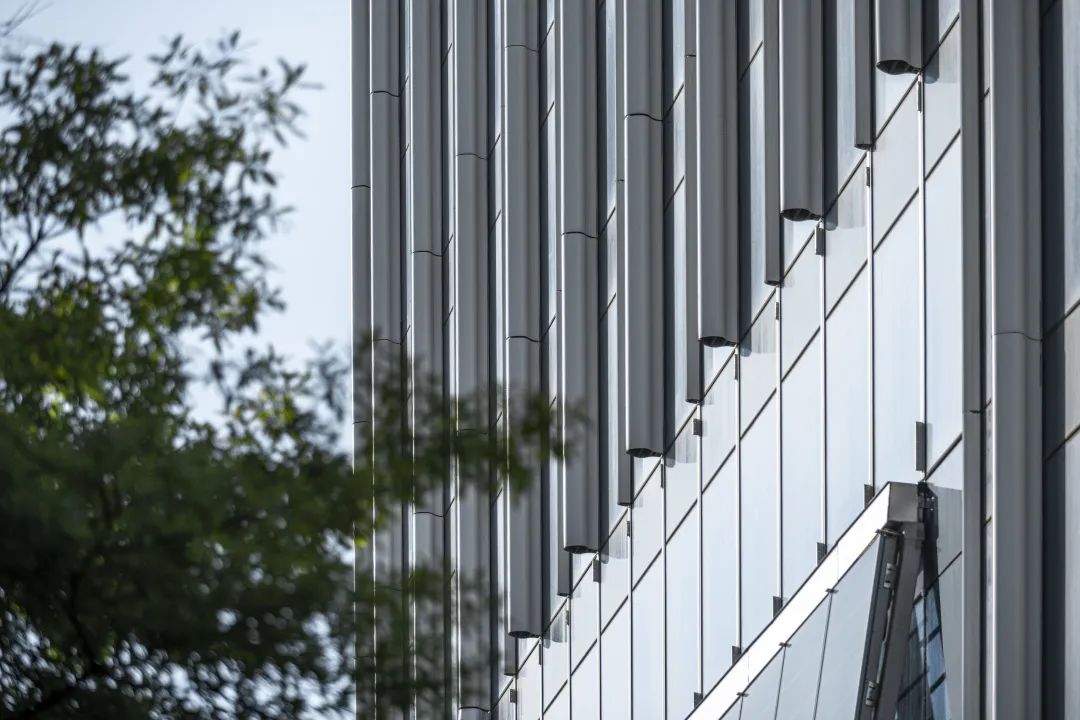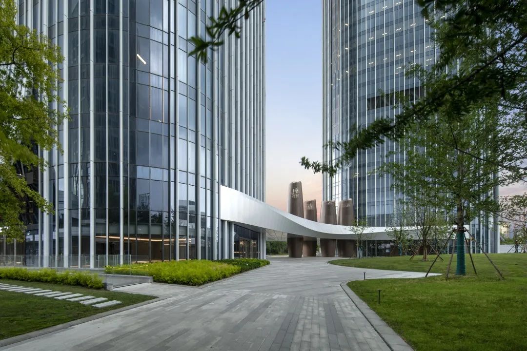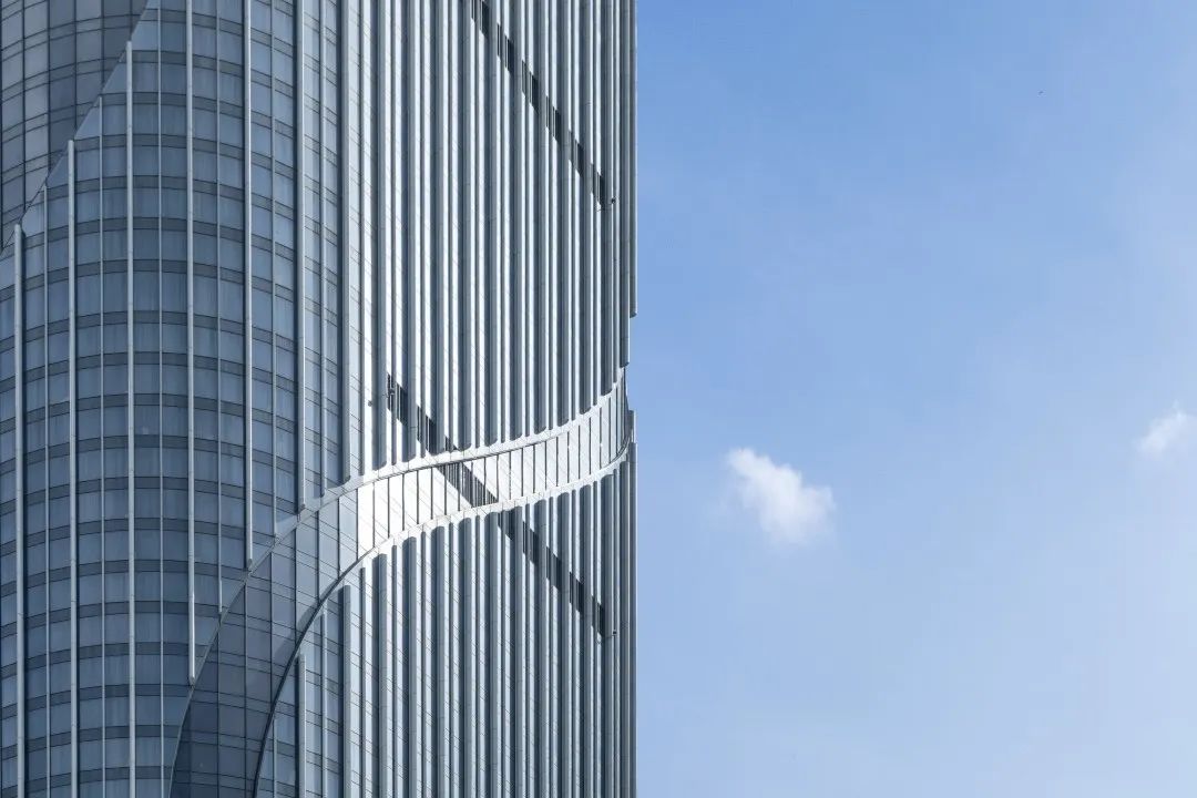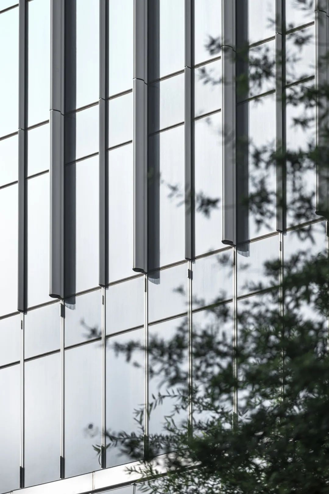 建筑造型简约内敛,双塔表皮进行竖向线条处理,包裹上玻璃幕墙,随着光线的折射而呈现出极具流动性的线型变化,创造出丰富的动态立面效果,仿佛是一组节律变幻的城市音符。