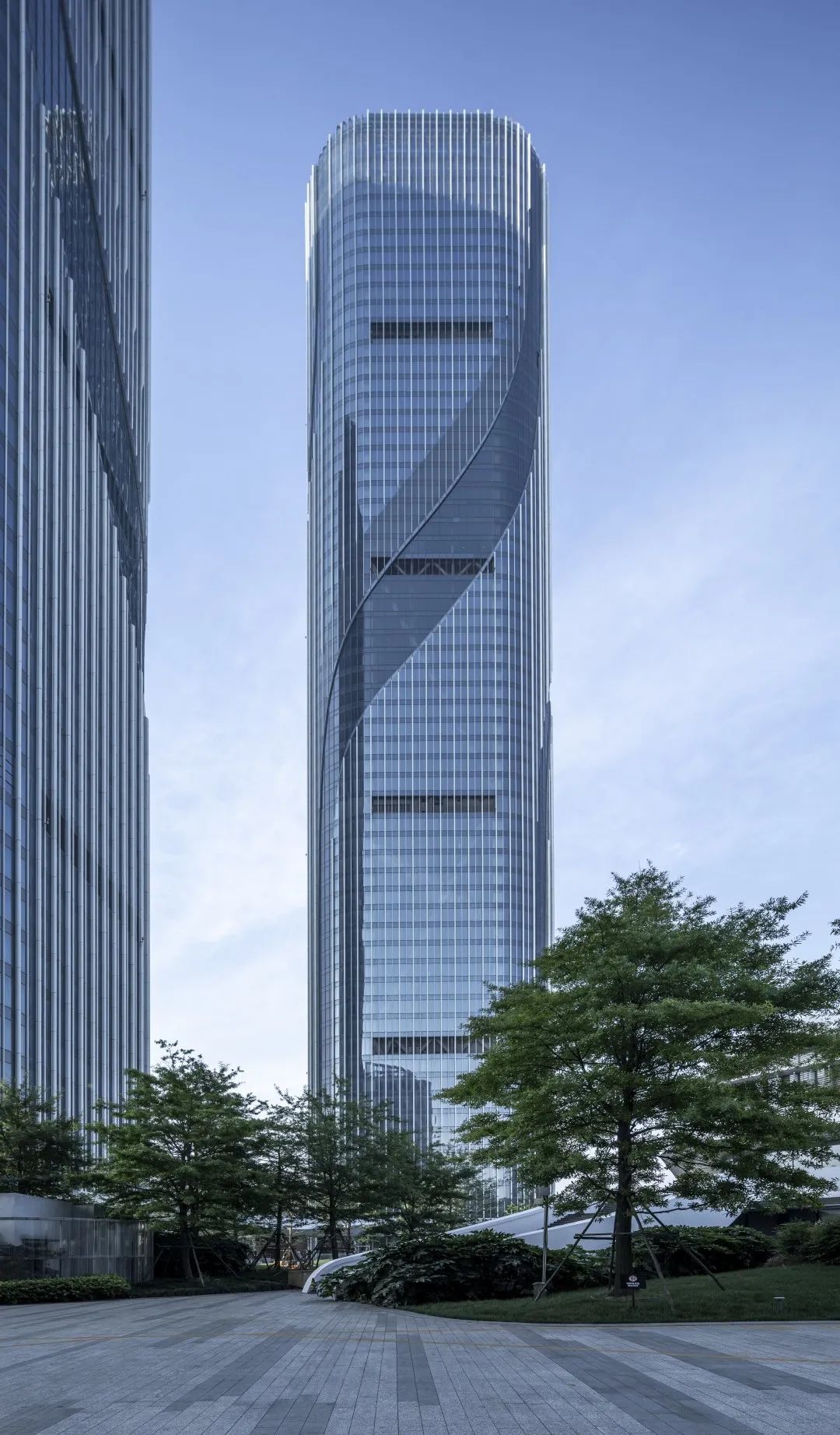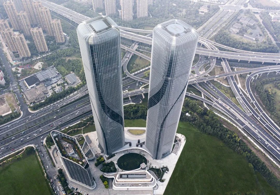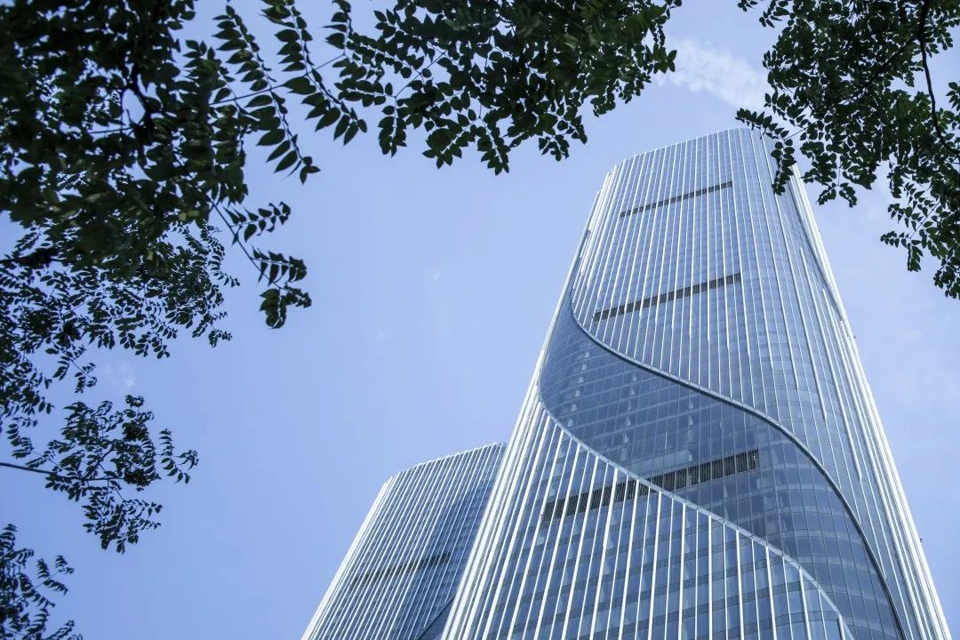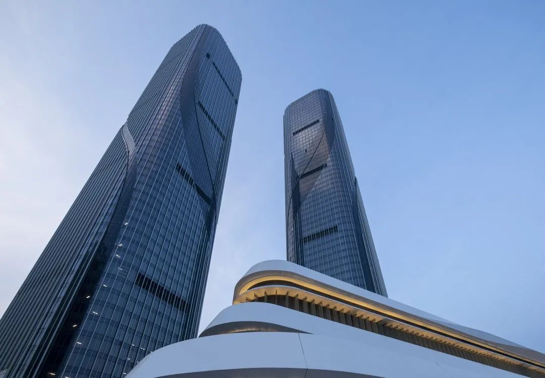建筑造型简约内敛,双塔表皮进行竖向线条处理,包裹上玻璃幕墙,随着光线的折射而呈现出极具流动性的线型变化,创造出丰富的动态立面效果,仿佛是一组节律变幻的城市音符。