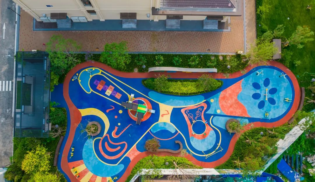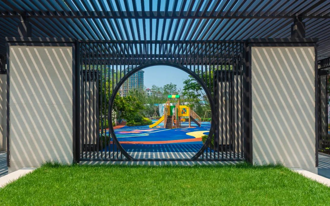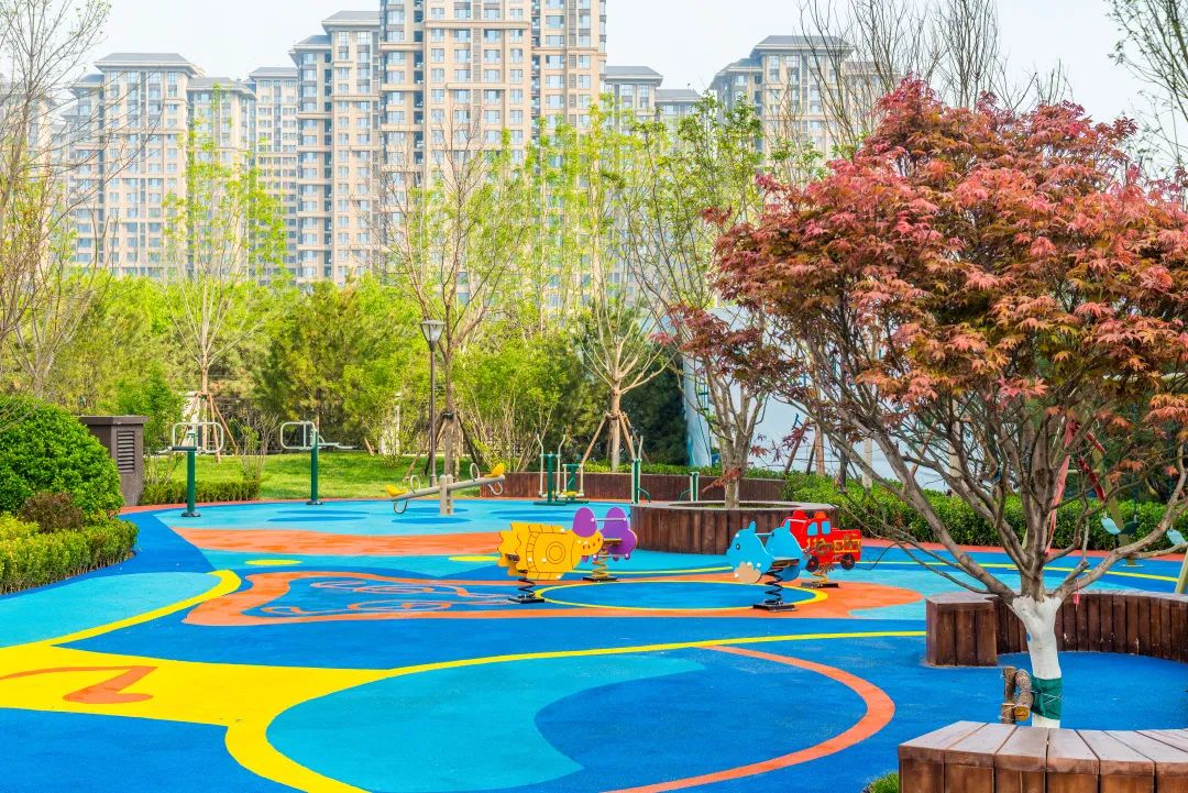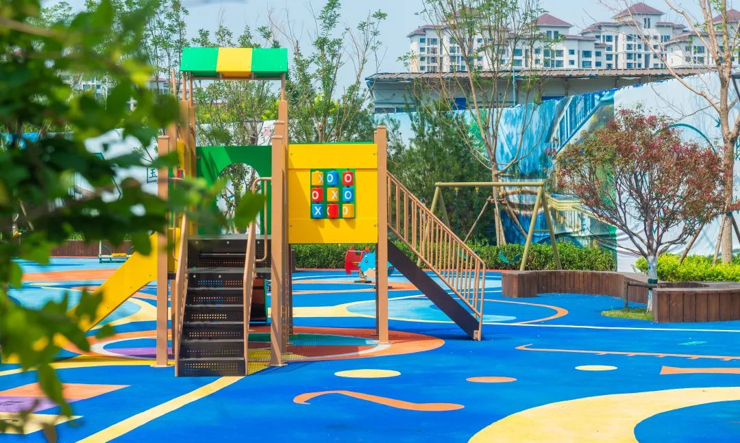 在色彩缤纷的塑胶材质铺成的全龄儿童活动场,看孩童们在滑梯、秋千、坡地与儿童慢跑道上尽情释放元气,聆听着属于少年的欢喜。