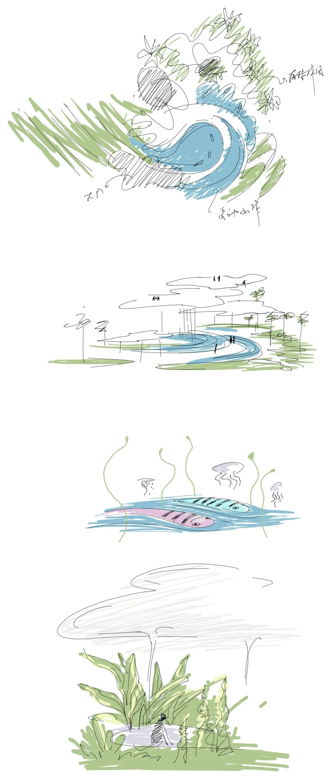 项目以一个C字型的景观动线,串联核心节点。自由的曲线漂浮于空中,在时间、天气的变幻下,以戏剧性的方式融合到周边的环境中。