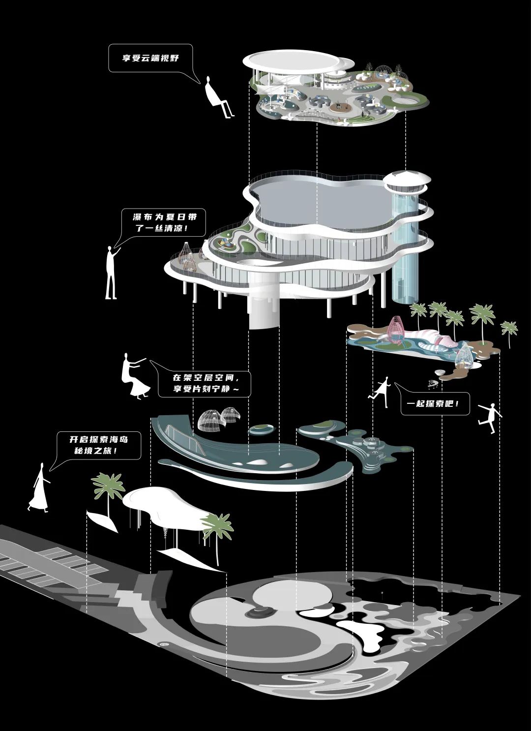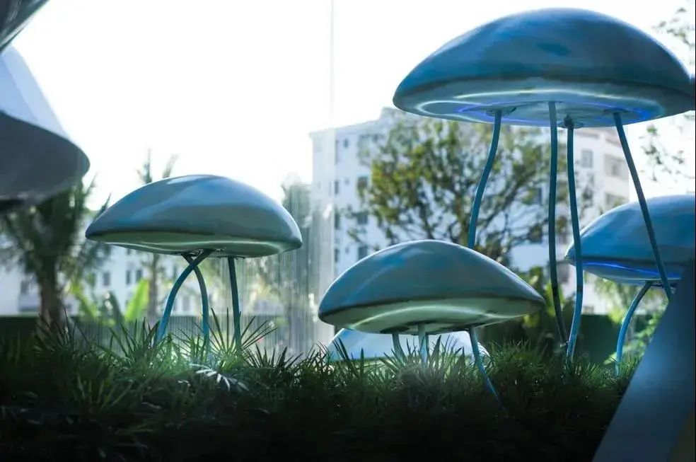 选取碧海、蓝天、浮云、椰树、风铃、水母、海螺等能够引起情感共鸣和城市记忆的元素,融合在景观场景当中。通过互动景观、装置雕塑、特色水景等艺术形式,以一个全新城市封面形象,讲述一个关于三亚的新故事。